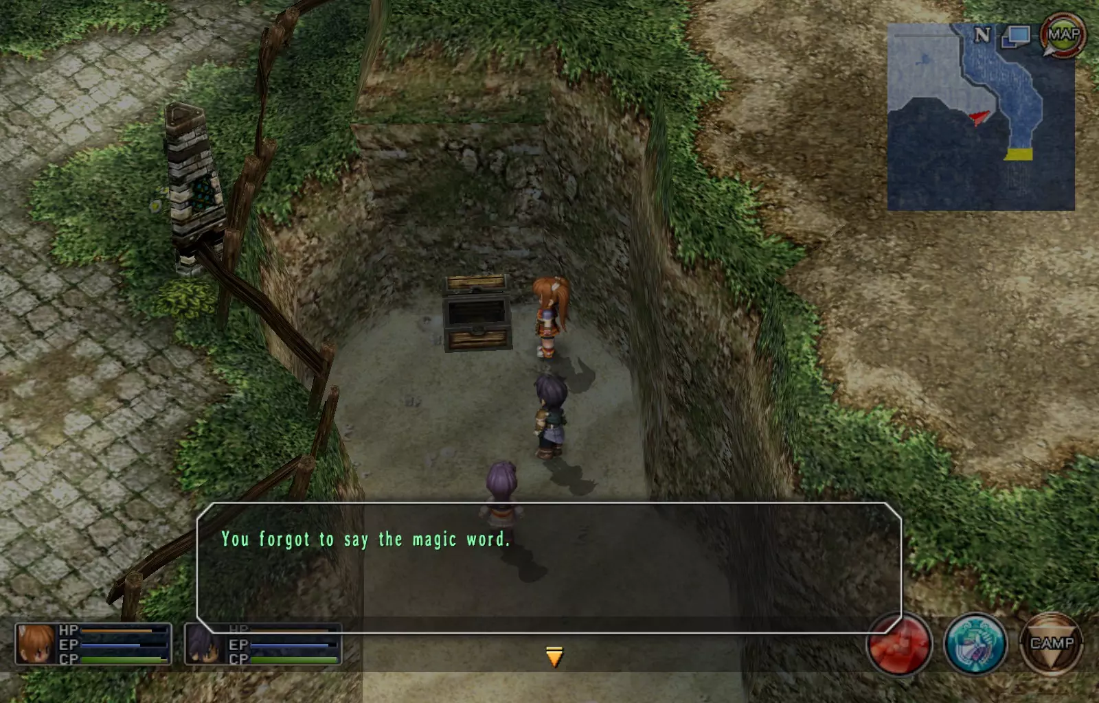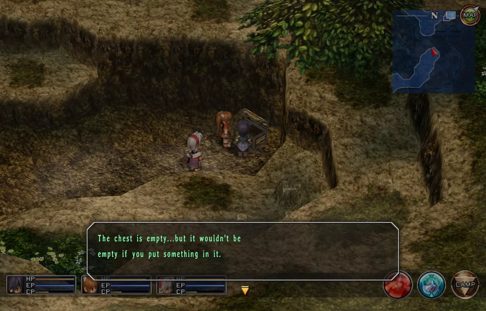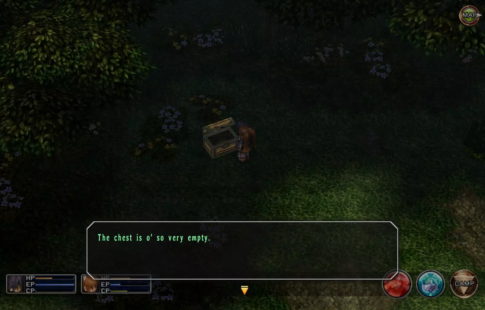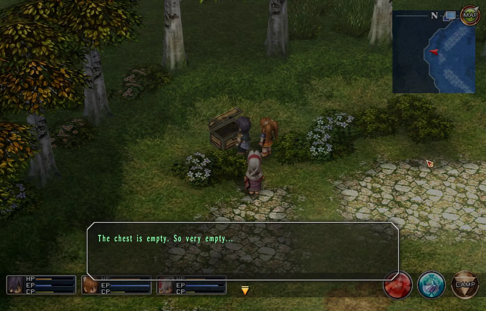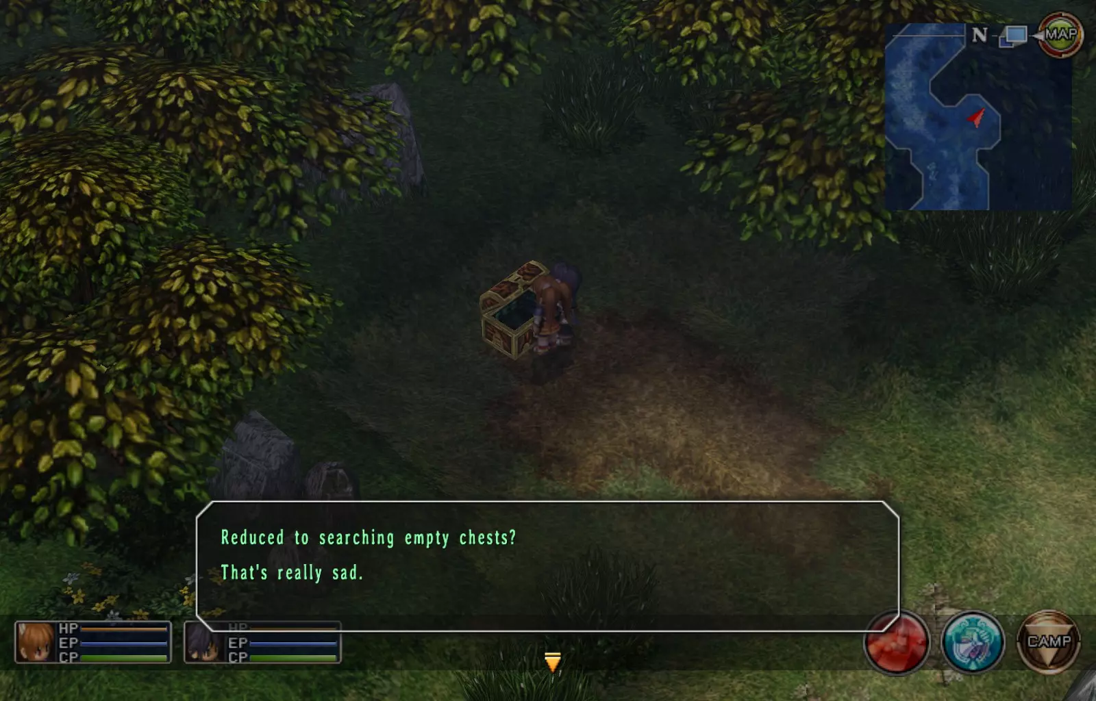 第一章结束结果:(33[+1][+3]/163个宝箱) 注意,这里又有3个宝箱不算数。我不知道是哪两个,因为检查完所有宝箱后,我显示的是33/163。 其中一个宝箱位于空贼要塞。另外两个,我不清楚。 第二章 克朗小径,卢安侧 [RKrTr] EP填充剂(38/163) 沿着小路走,你会看到小路分叉通向一些树木。宝箱就藏在这些树下面。