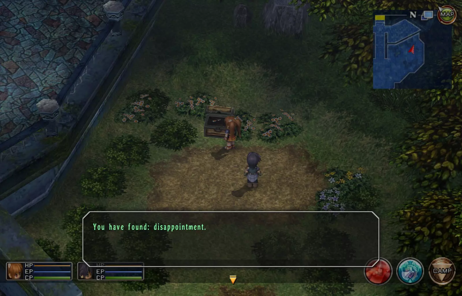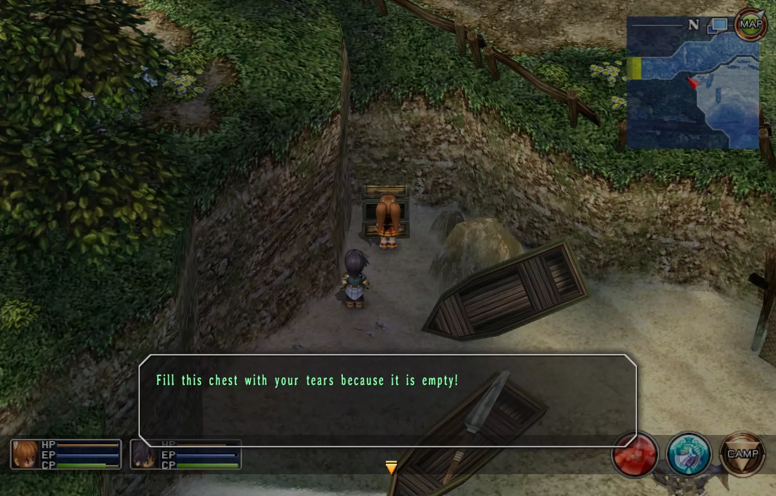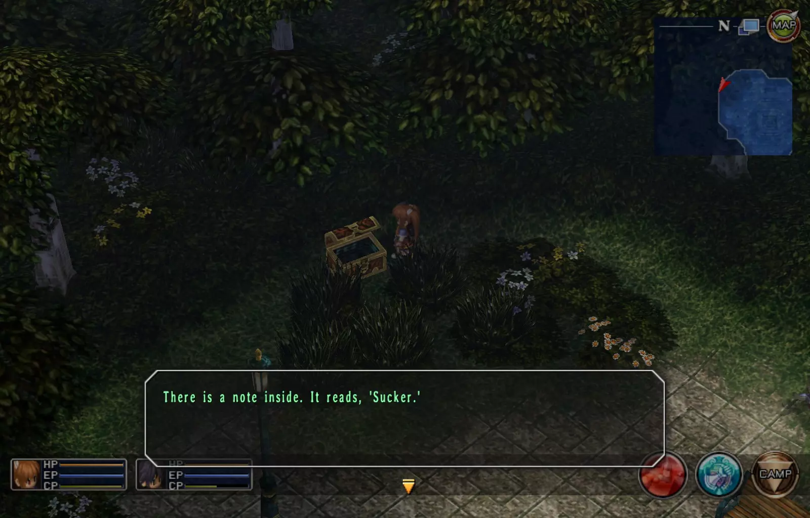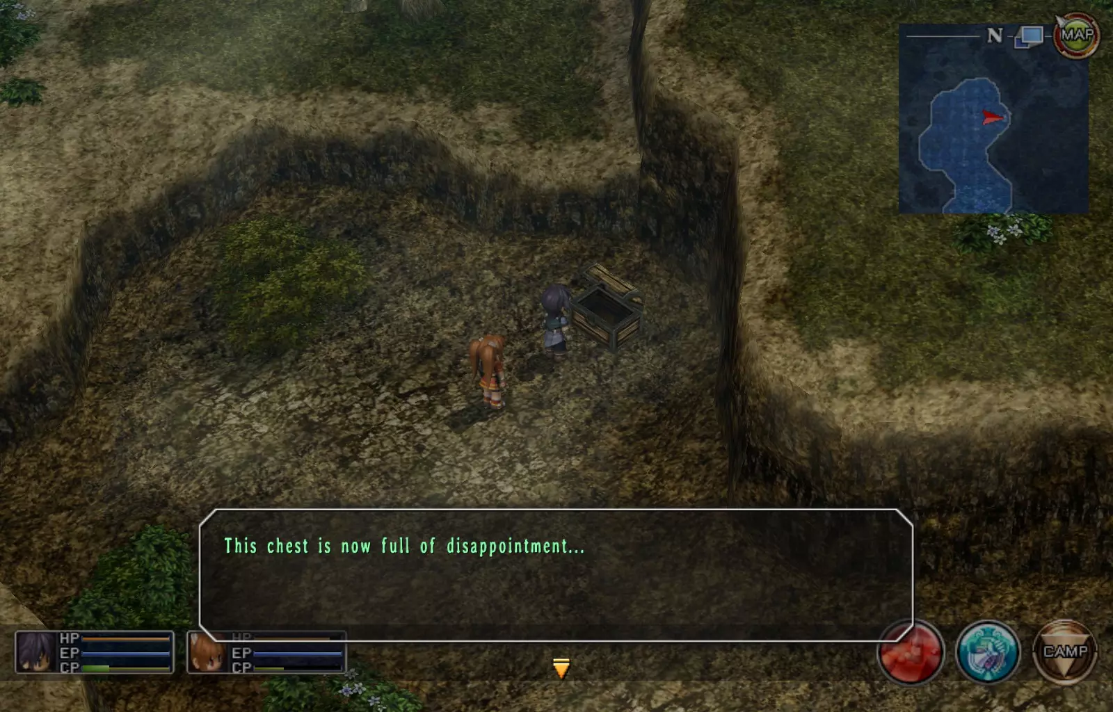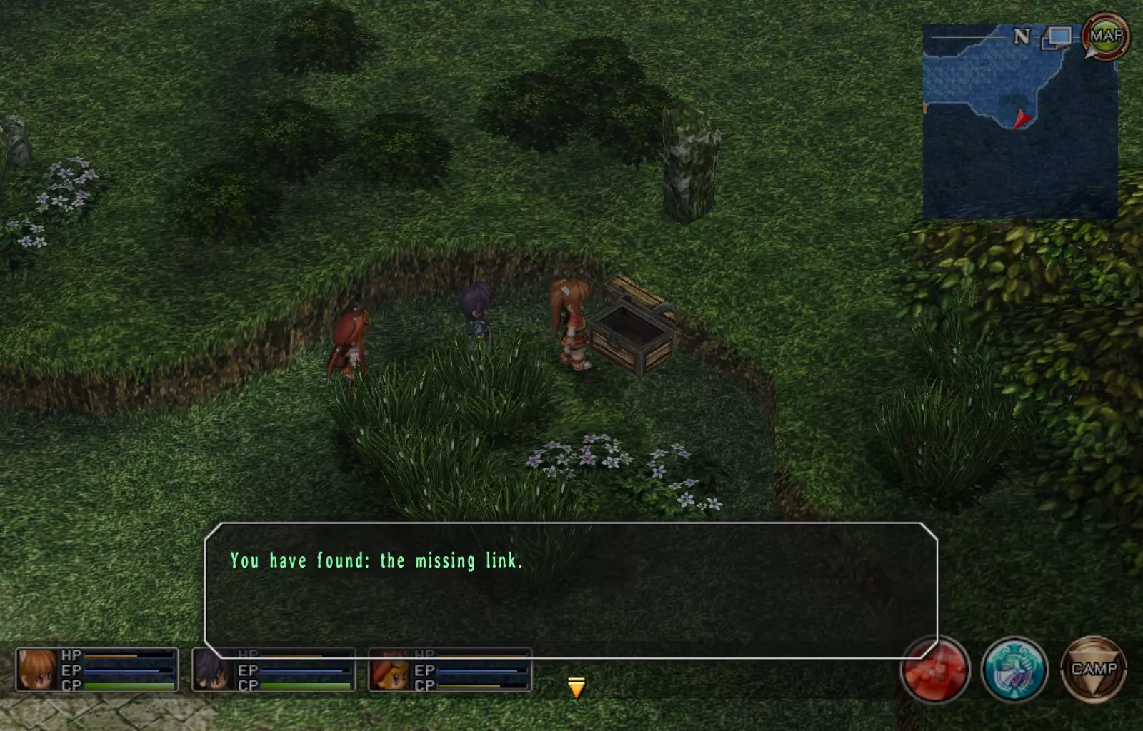 第一章结束结果:(33[+1][+3]/163个宝箱) 注意,这里又有3个宝箱不算数。我不知道是哪两个,因为检查完所有宝箱后,我显示的是33/163。 其中一个宝箱位于空贼要塞。另外两个,我不清楚。 第二章 克朗小径,卢安侧 [RKrTr] EP填充剂(38/163) 沿着小路走,你会看到小路分叉通向一些树木。宝箱就藏在这些树下面。