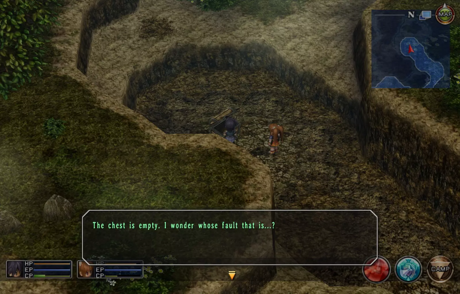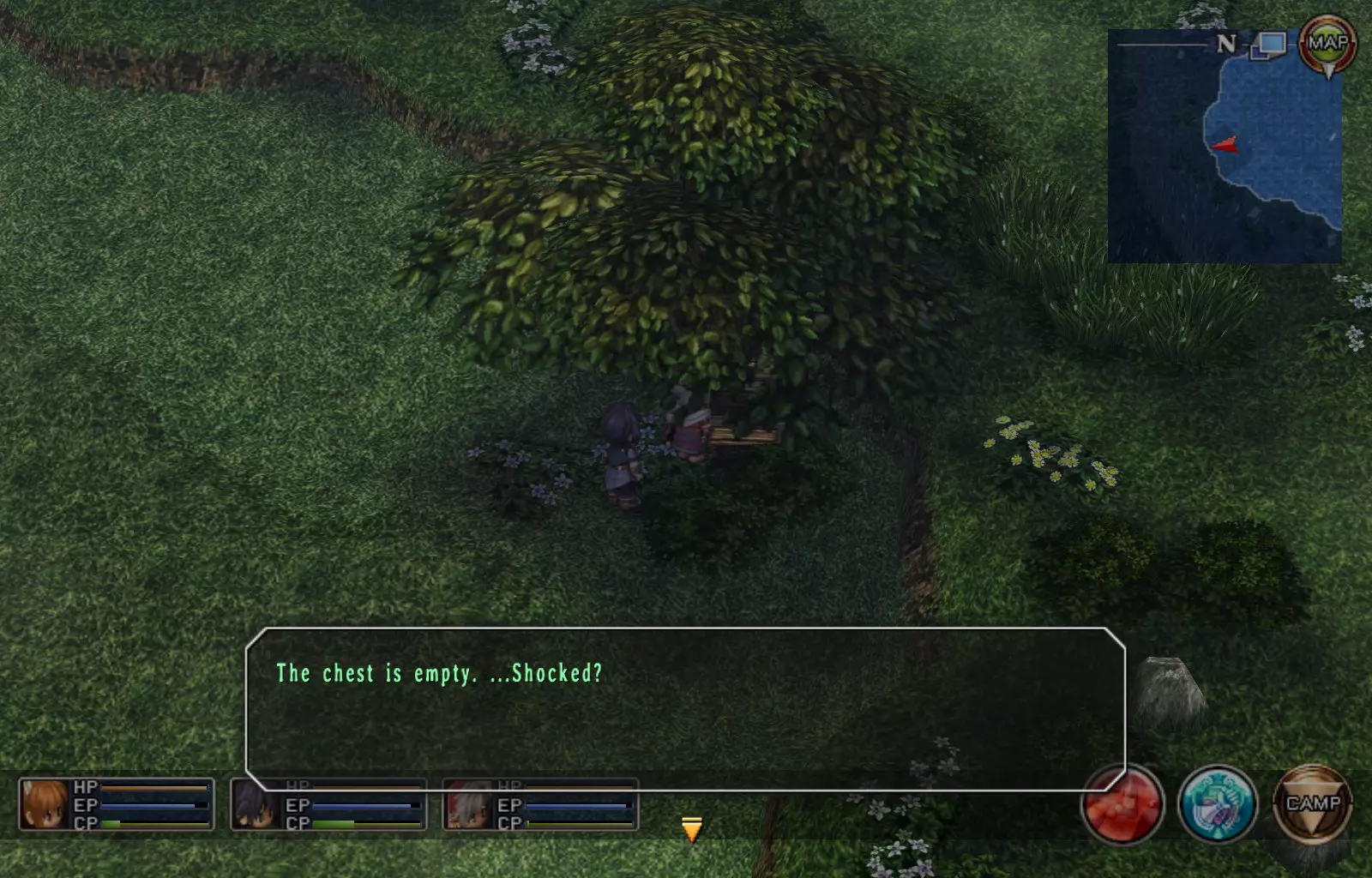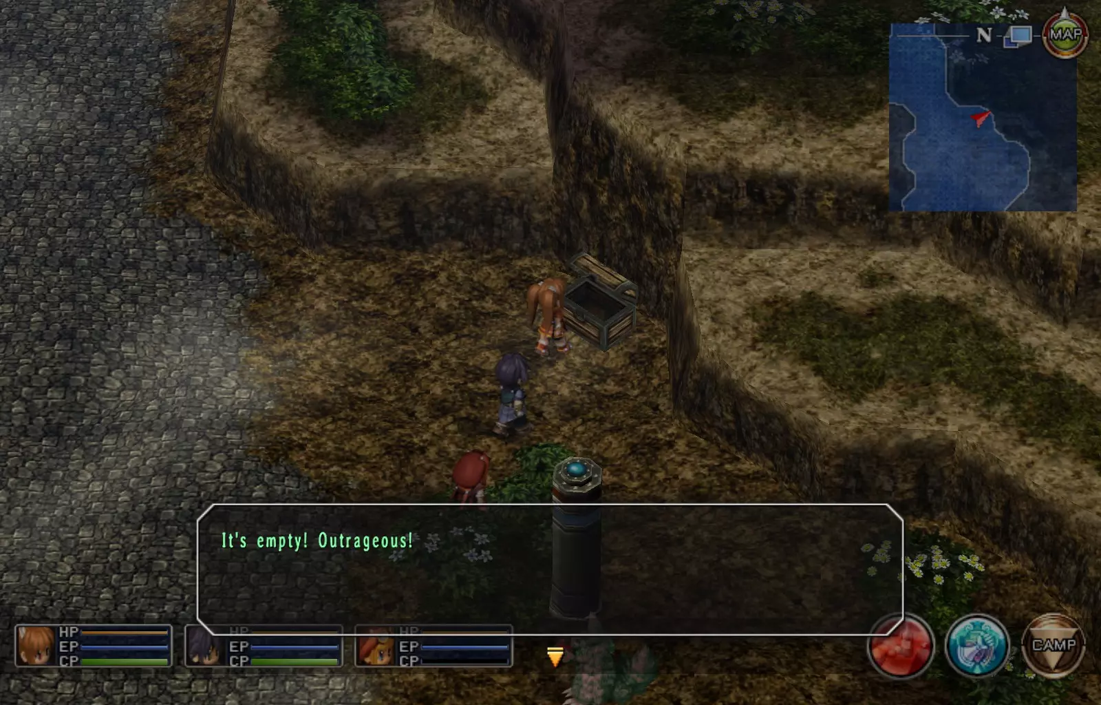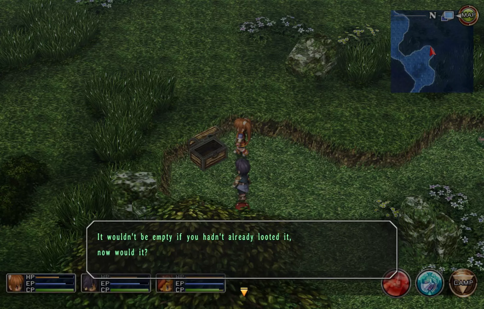 第一章结束结果:(33[+1][+3]/163个宝箱) 注意,这里又有3个宝箱不算数。我不知道是哪两个,因为检查完所有宝箱后,我显示的是33/163。 其中一个宝箱位于空贼要塞。另外两个,我不清楚。 第二章 克朗小径,卢安侧 [RKrTr] EP填充剂(38/163) 沿着小路走,你会看到小路分叉通向一些树木。宝箱就藏在这些树下面。