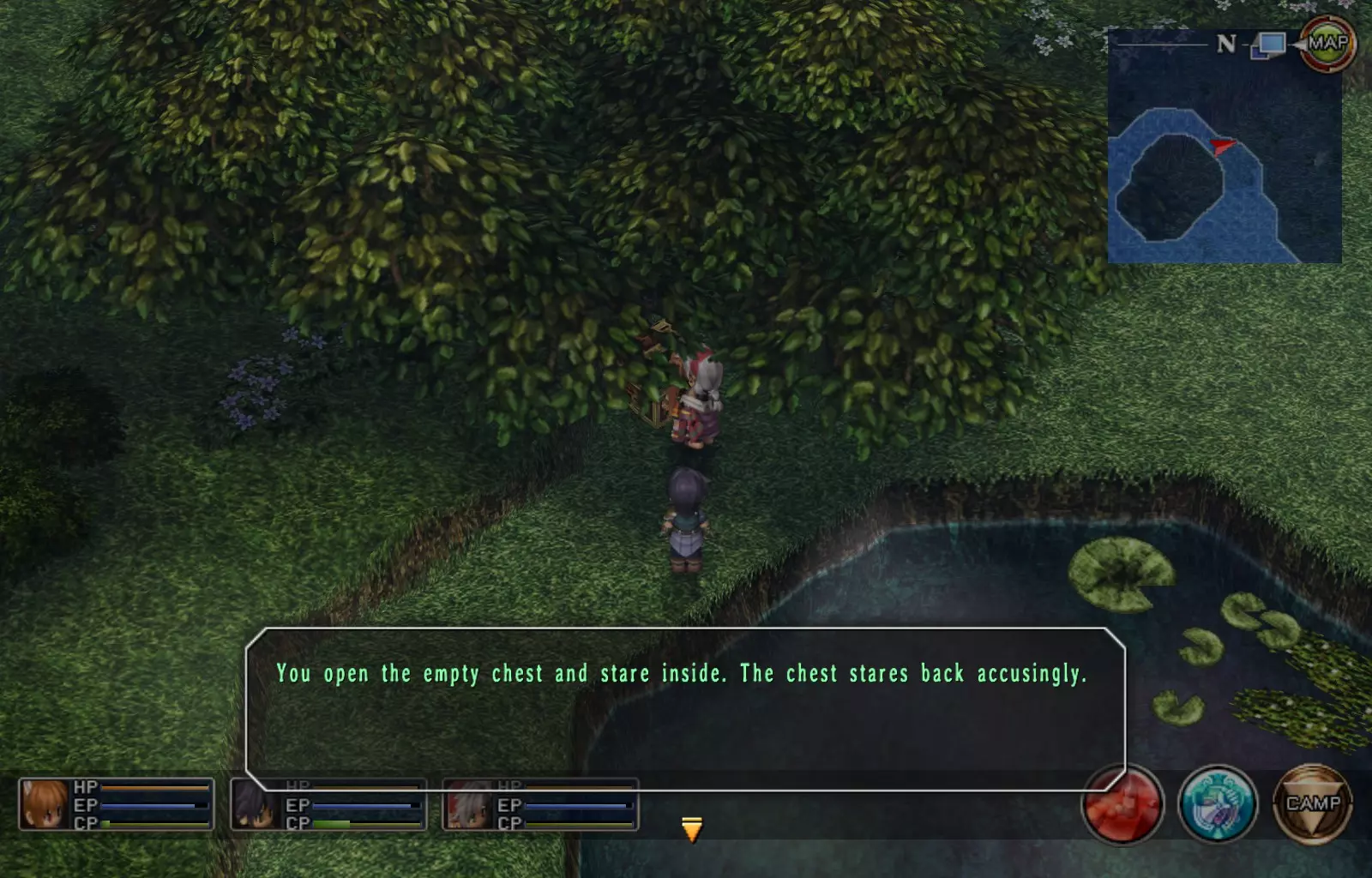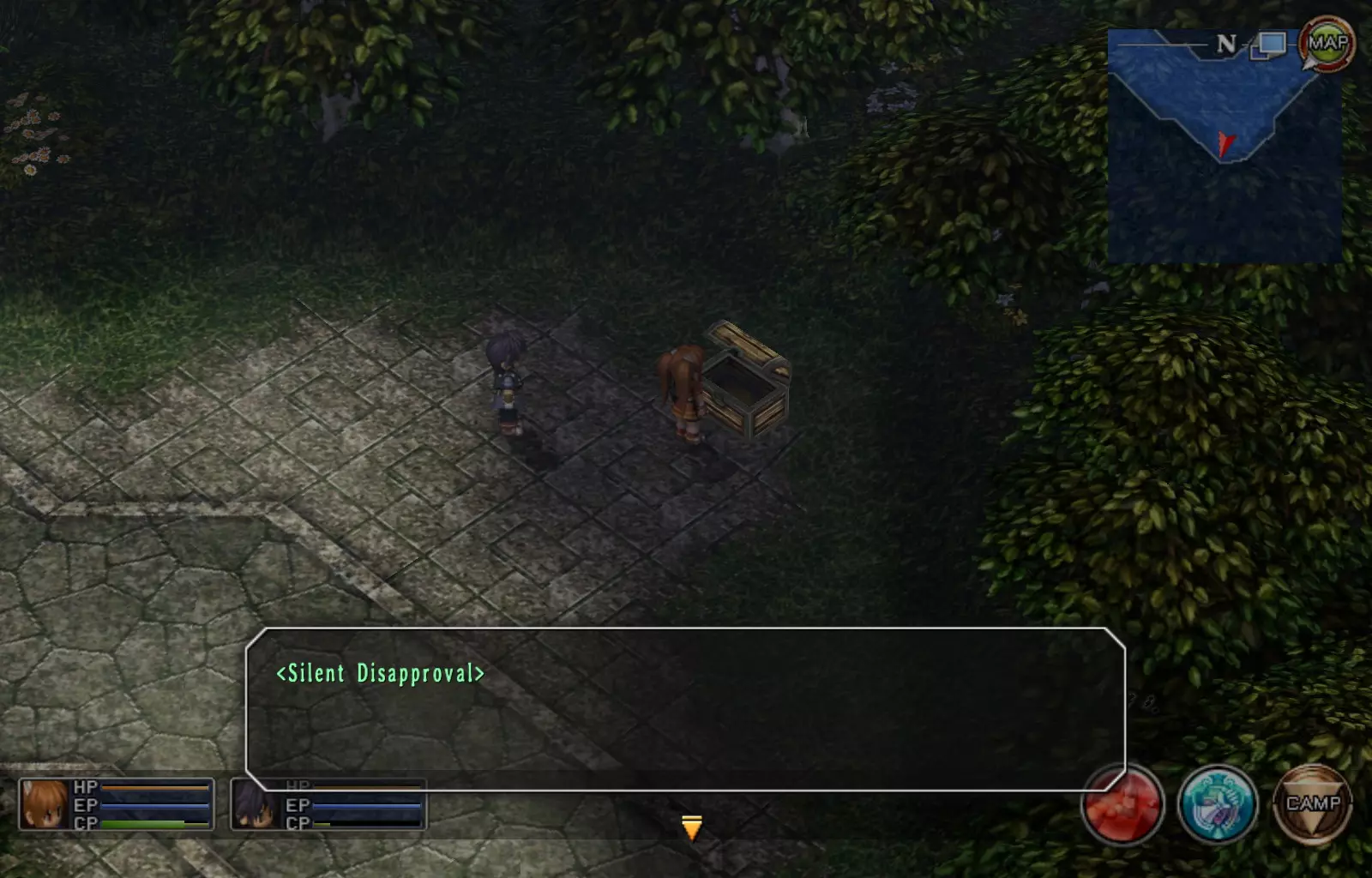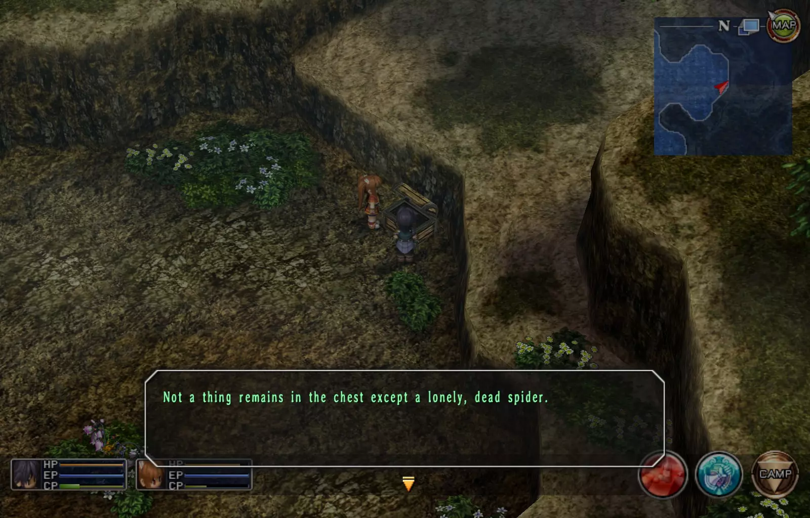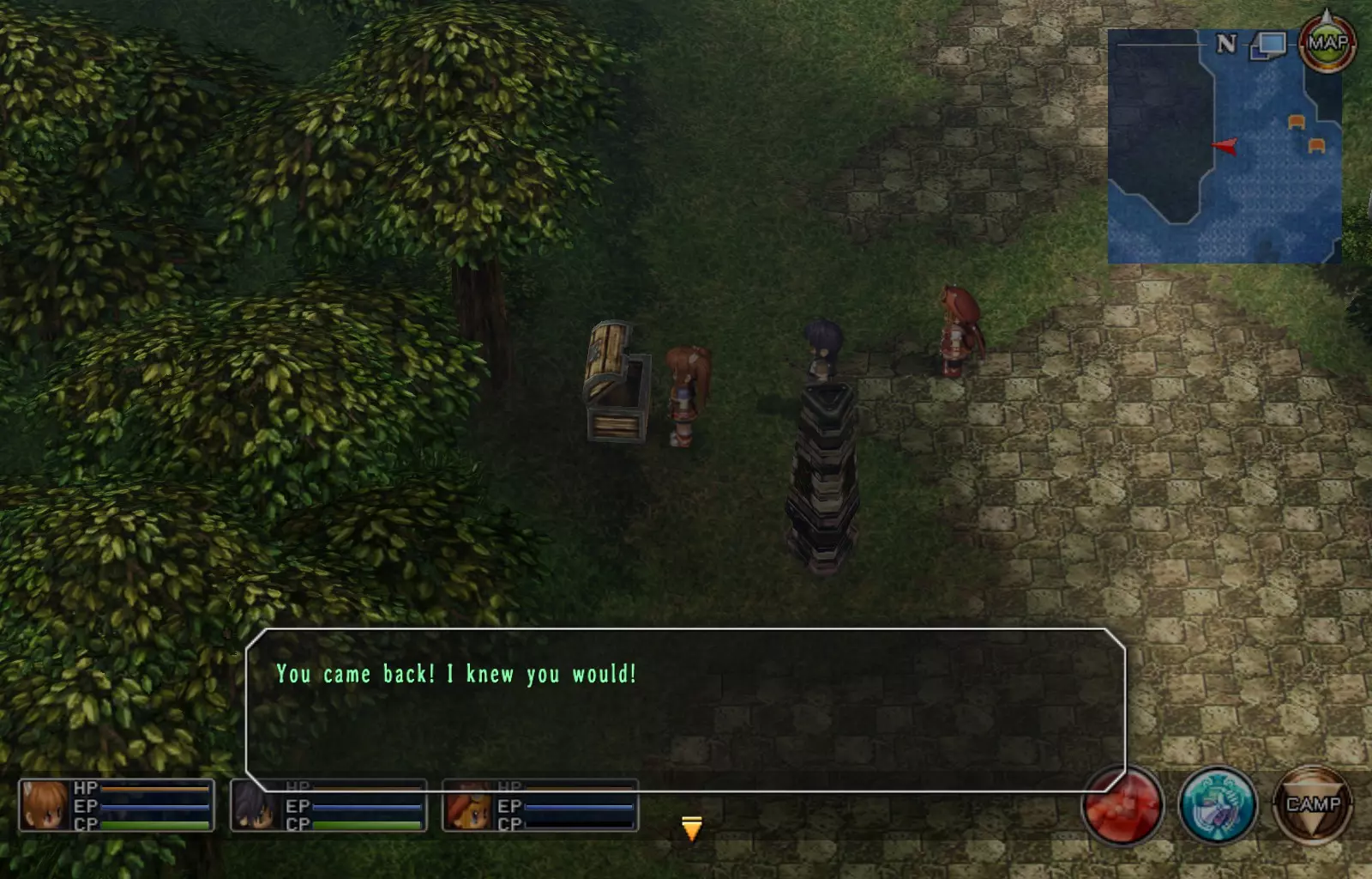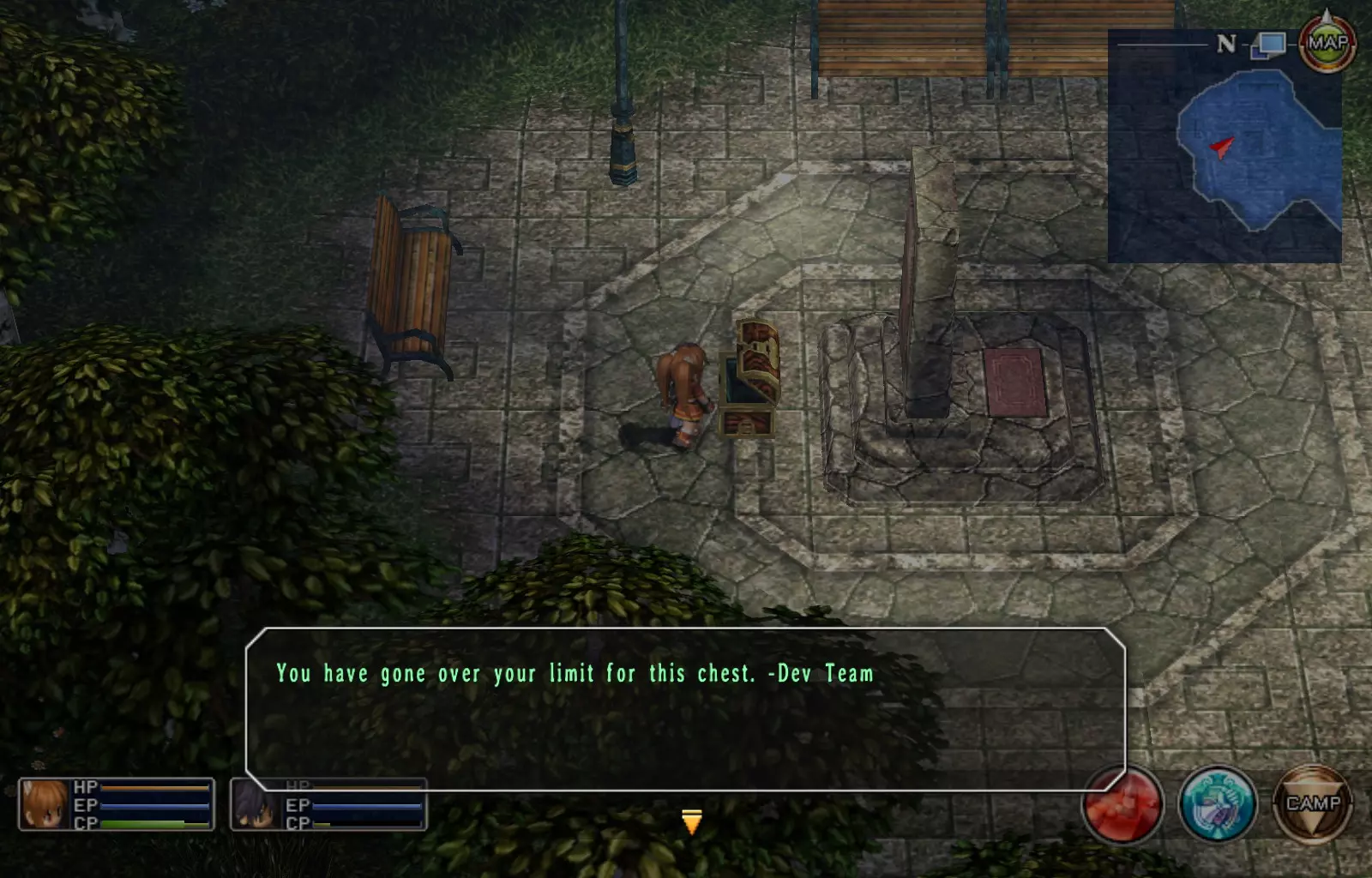 第一章结束结果:(33[+1][+3]/163个宝箱) 注意,这里又有3个宝箱不算数。我不知道是哪两个,因为检查完所有宝箱后,我显示的是33/163。 其中一个宝箱位于空贼要塞。另外两个,我不清楚。 第二章 克朗小径,卢安侧 [RKrTr] EP填充剂(38/163) 沿着小路走,你会看到小路分叉通向一些树木。宝箱就藏在这些树下面。