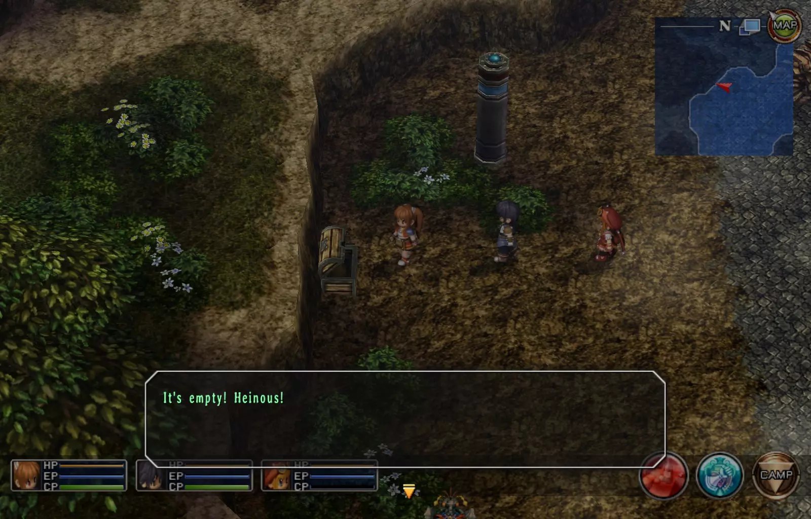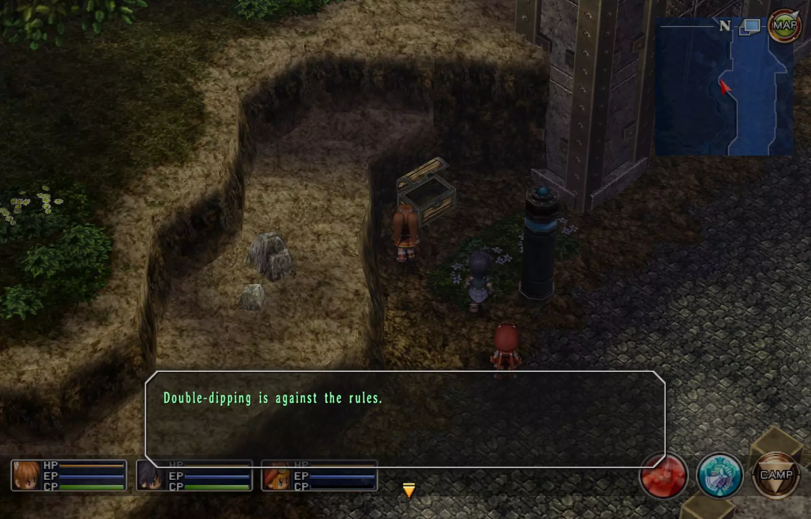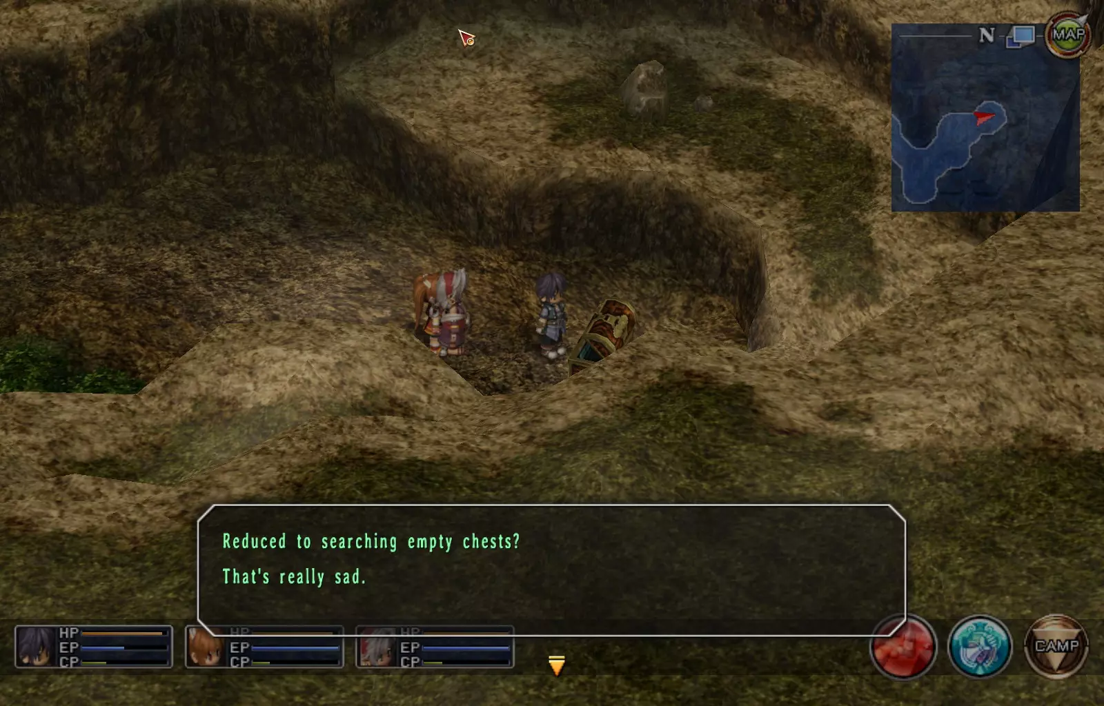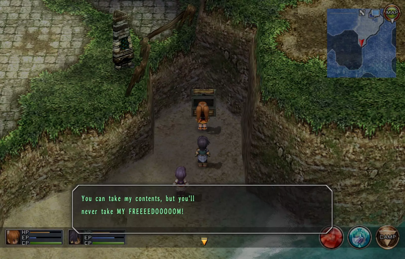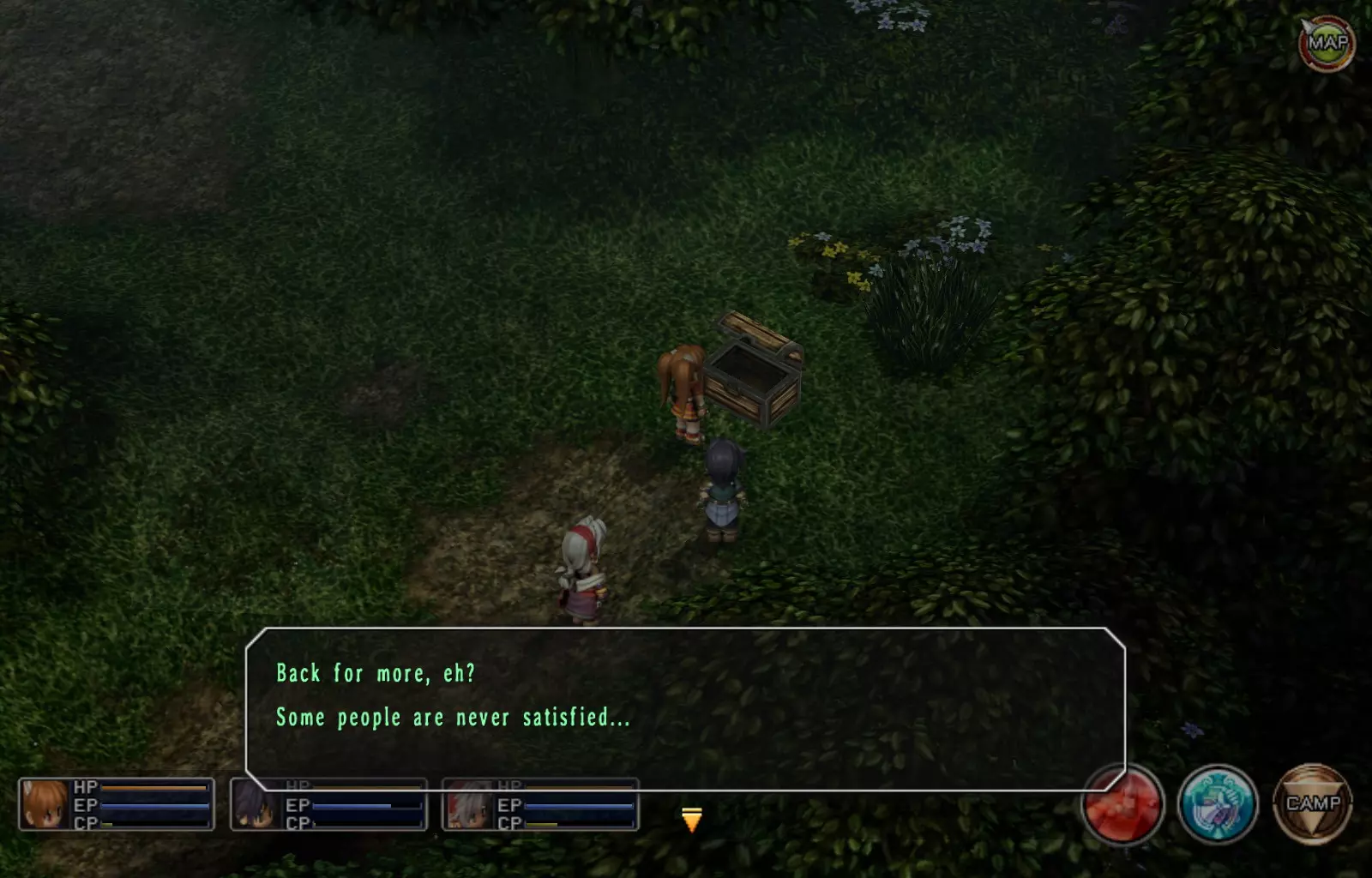 第一章结束结果:(33[+1][+3]/163个宝箱) 注意,这里又有3个宝箱不算数。我不知道是哪两个,因为检查完所有宝箱后,我显示的是33/163。 其中一个宝箱位于空贼要塞。另外两个,我不清楚。 第二章 克朗小径,卢安侧 [RKrTr] EP填充剂(38/163) 沿着小路走,你会看到小路分叉通向一些树木。宝箱就藏在这些树下面。