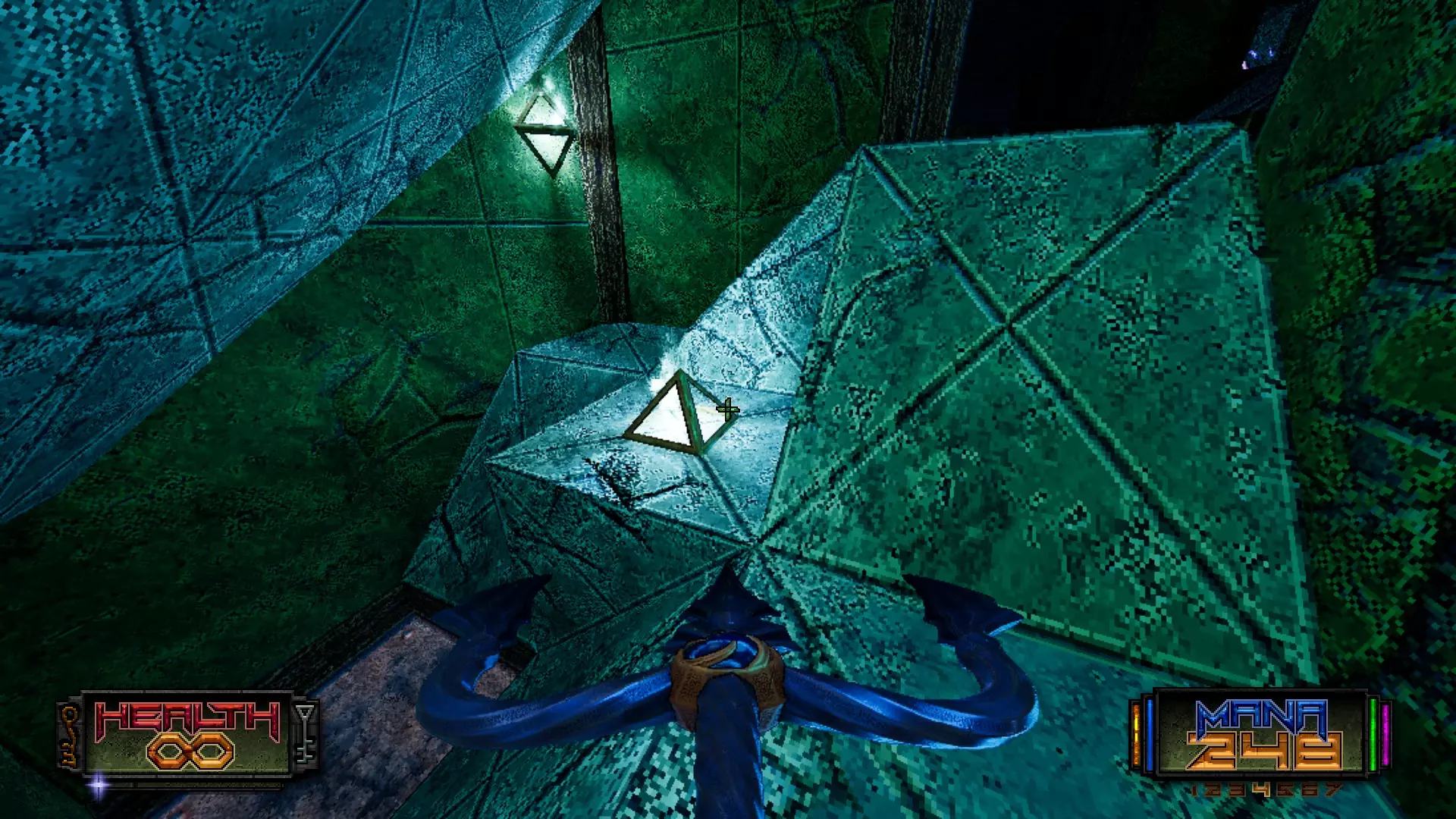 跳过天花板横梁,进入一个三角形的房间。
