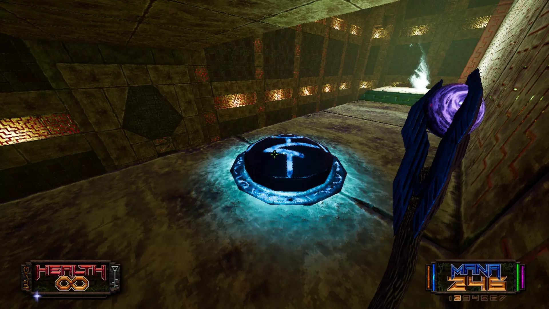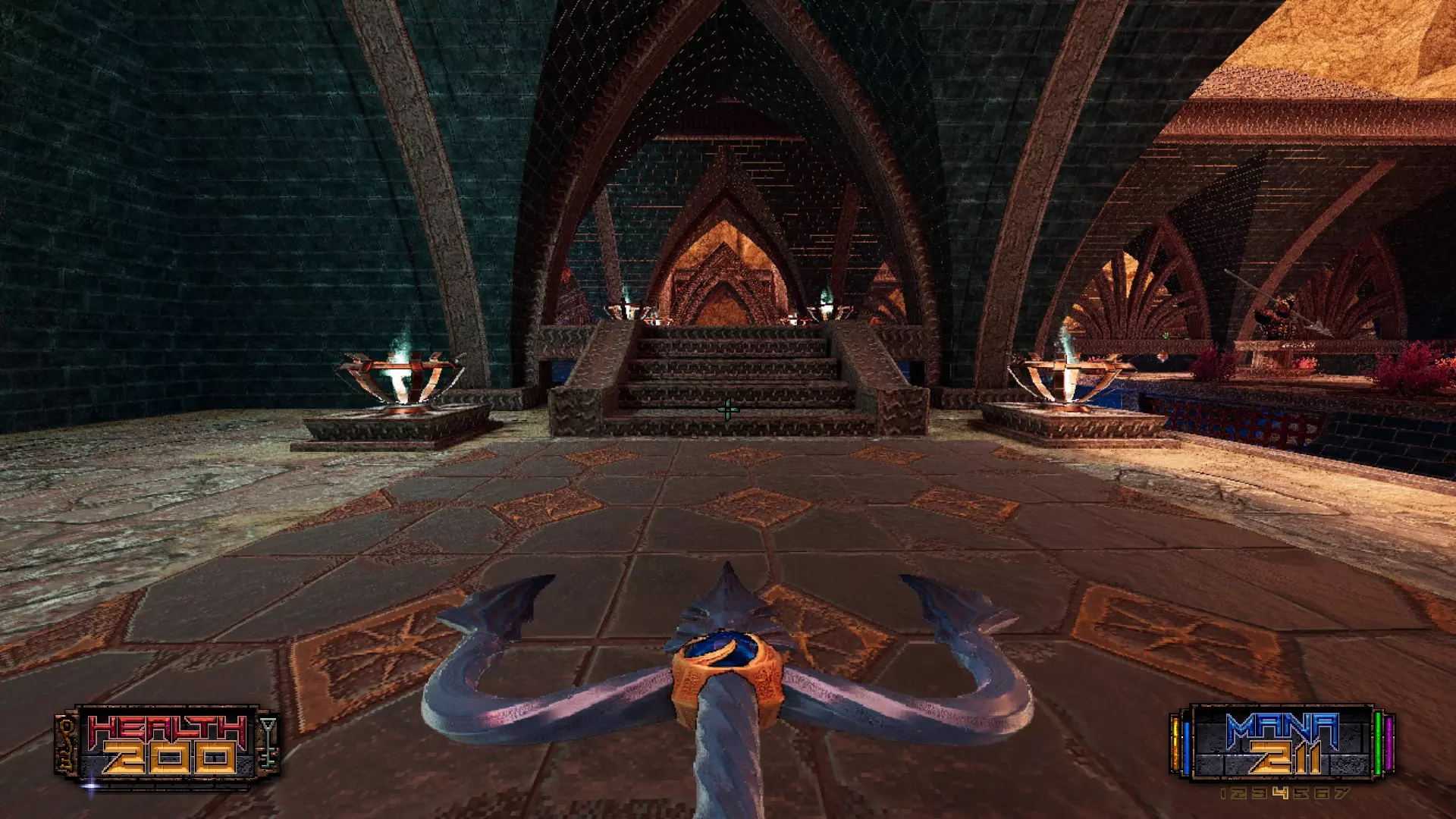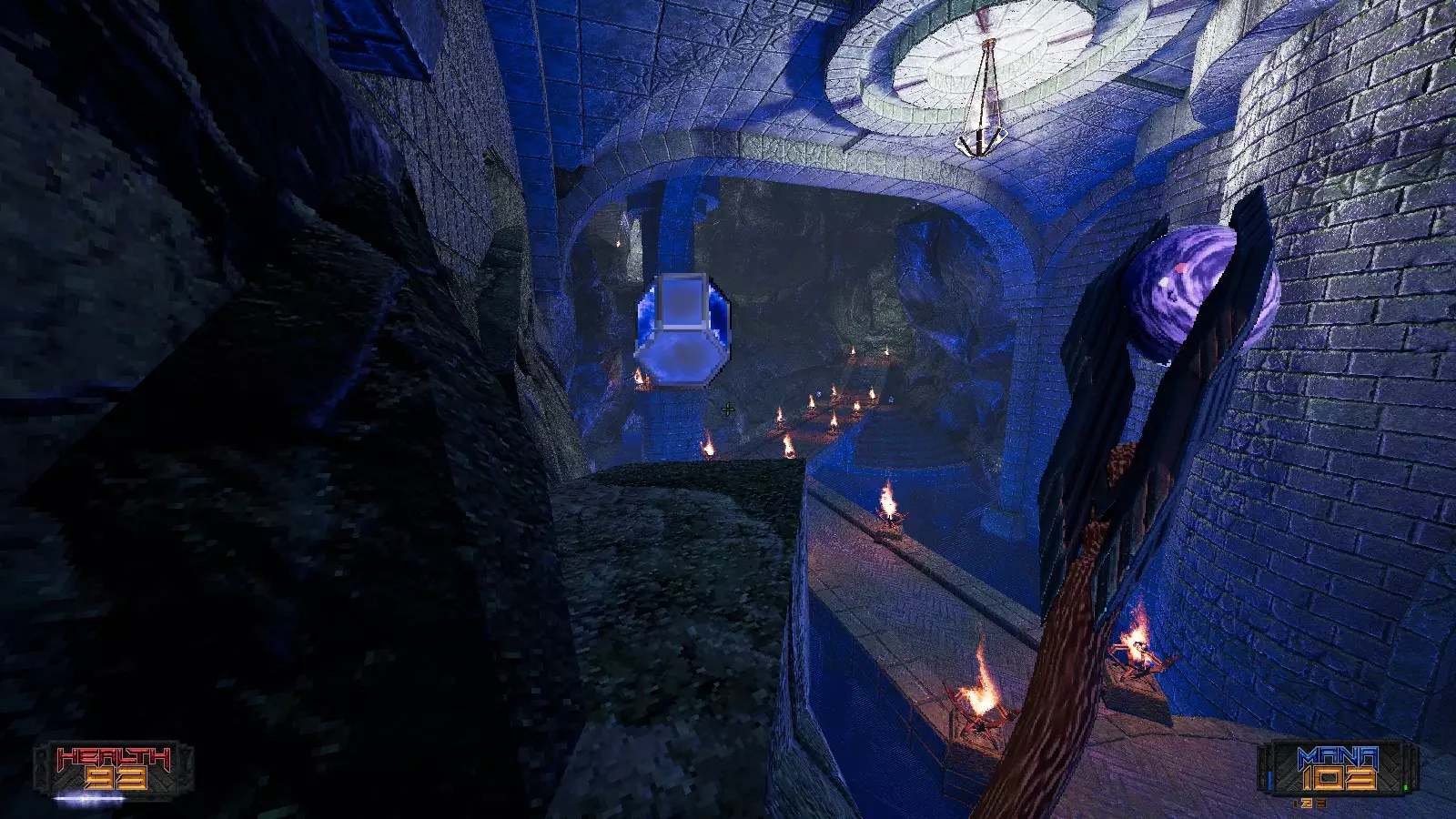 秘密4:穿过巨大神庙内的一座桥后,朝着准星指示的蓝色火焰旁跳下去。下方有一个隐藏开关,按下后会打开对面的密室。这座神庙大厅非常大,所以存在第二个甚至第三个秘密也不足为奇。