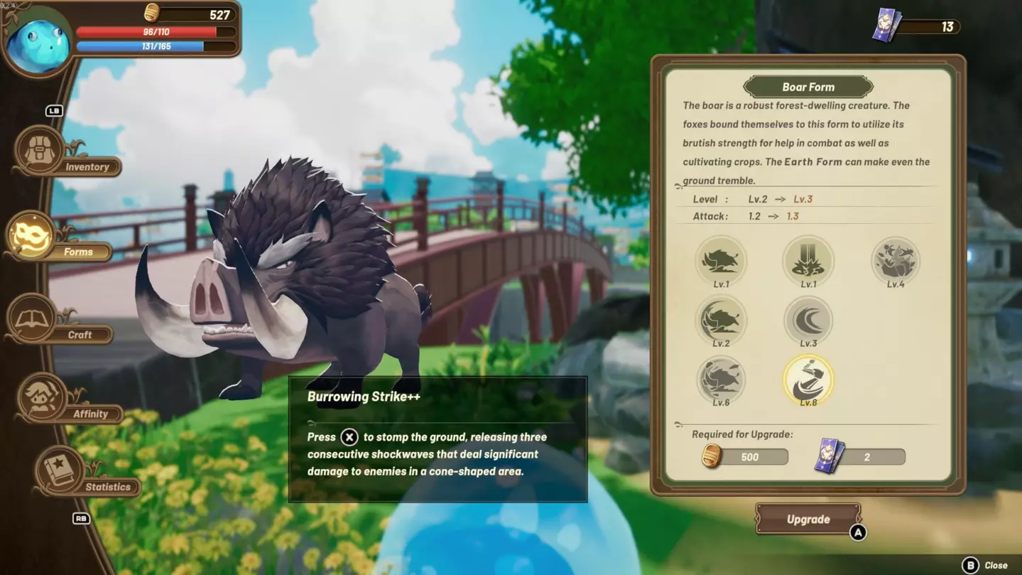 #1 - 无需工具? 与大多数 farming 游戏不同,你不需要工具来收集资源。相反,你将使用你的 Yokai(妖怪)来完成大部分农场杂务! 这是一个非常轻微且明显的游戏剧透,但你可以变身成 Yokai,每种 Yokai 都有不同的特性和天赋,可用于改善游戏体验。例如,你解锁的第一种形态——实际上是在教程期间——是野猪,游戏早期会让你使用地面猛击能力来翻耕土地以播种。 但你也可以用它来开采岩石或砍伐树木,而游戏完全没有告诉你这一点,至少我没看到相关提示。