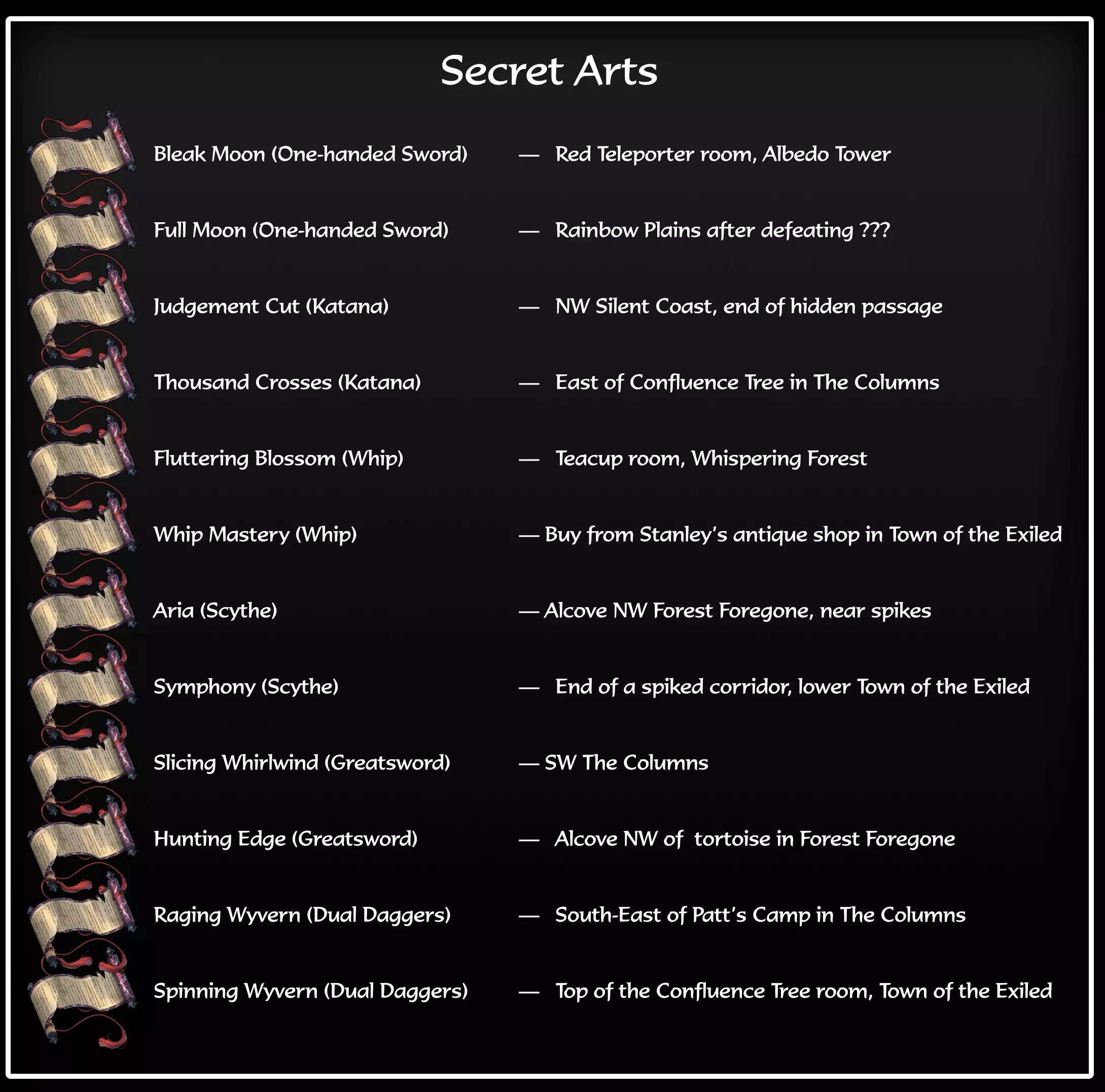 学习所有秘传技艺。 秘传技艺是游戏中的另一种收集品,通常来自与武器、 armor(盔甲)、饰品相同的宝箱,因此需要在地图上追踪寻找。游戏中共有12种秘传技艺,每种武器类型对应2种,你需要全部找到。注意,此成就会在你找到所有秘传技艺时解锁。如果你不想的话,实际上不需要通过投入天赋点来“学习”所有秘传技艺。正如路线图中所提到的,要特别感谢demajen团队所付出的巨大努力,他们不仅整理了所有这些信息,还为游戏的每个区域都制作了100%探索度地图。 在列表的中间位置,有一个名为【Locations - 12 Secret Arts】的文件。打开该文件可以大致了解每个【秘传技艺】的位置。利用他们制作的地图,你可以追踪到每个【秘传技艺】的具体位置,从而收集齐所有你遗漏的部分。