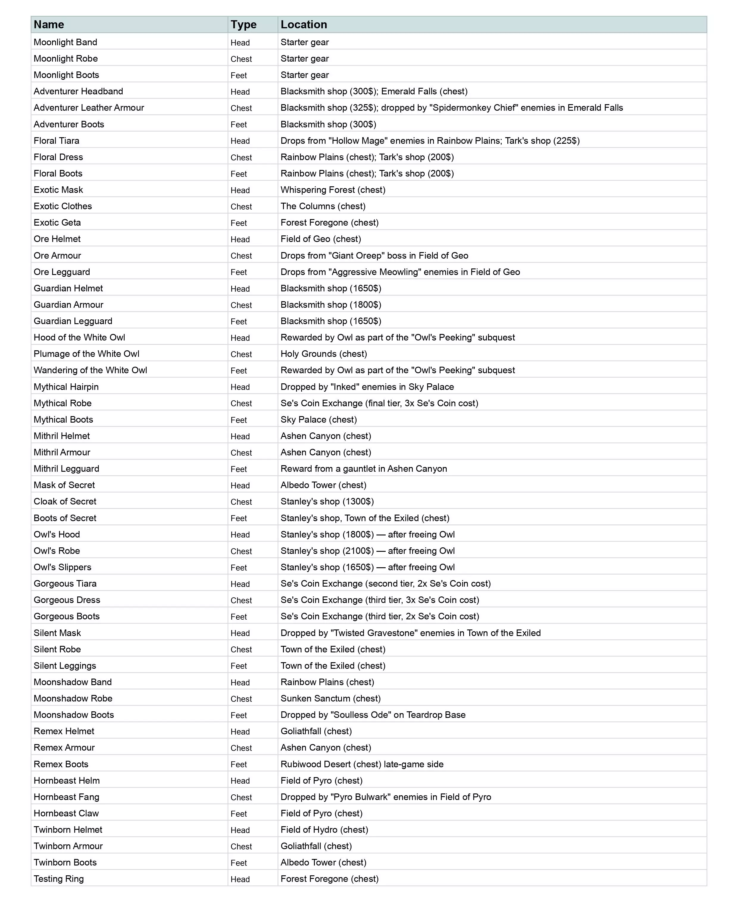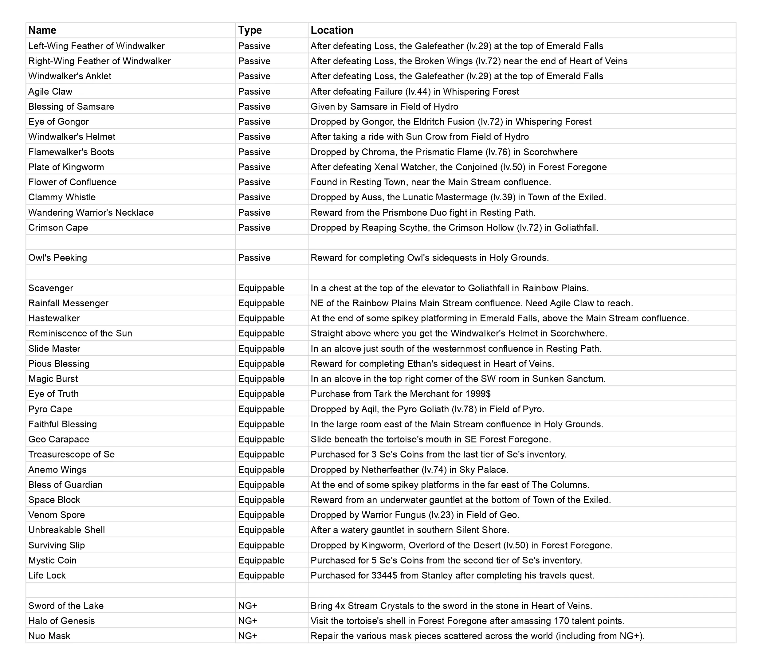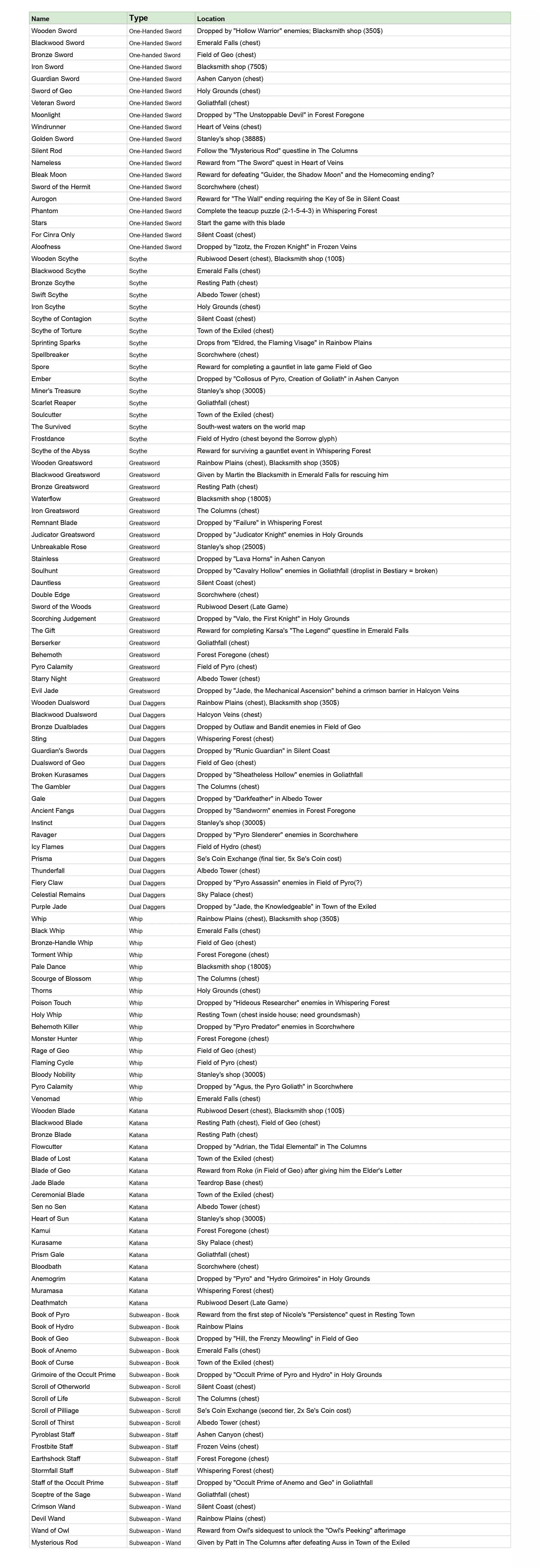 收集所有武器和防具。 此成就需要收集121件武器和52件防具,而【Se's Apprentice】成就则需要收集64件饰品。 注意:只有一件饰品【Black Rock Heart】需在完成二周目模式后才能获得,其他所有武器、防具和饰品均可在普通流程中获取。 在探索完所有区域前,无需急于完成这两个成就,因为通过探索、开宝箱、击败 bosses、完成任务等方式,你会自然收集到绝大多数的武器、防具和饰品。 当你准备好完成此成就进行查漏补缺时,好在有便捷的方法可以查看遗漏物品。前往流亡者镇的斯坦利古董店(如下图所示,我的地图上卷轴图标位置),进入店内后上楼。楼上有三面镜子,每面镜子分别显示你目前已找到的所有武器、 armor(装备)或饰品,以及未找到物品的问号标记和总数。这些列表按固定顺序排列,因此很容易提供一份包含所有武器、装备和饰品的总清单进行对照。正如路线图中所提到的,要特别感谢demajen团队所付出的巨大努力,他们不仅整理了所有这些信息,还为游戏的每个区域制作了100%探索度地图。 在云端硬盘列表中一直滚动到最底部,最后一个文件是一个谷歌表格,其中包含武器、 armor(装备)、饰品等标签页。每个标签页都按照游戏中出现的顺序列出了所有物品。你可以在斯坦利商店的镜子中浏览物品列表,并与谷歌表格中的列表进行交叉对照,从而找出自己遗漏的物品。高亮标记出你遗漏的物品,表格中有一栏会说明每件物品的获取位置。如果武器、装备或饰品是在宝箱中,可使用地图快速找到对应地图上的宝箱位置,然后前往获取。有些物品只能从敌人身上掉落。攻略表会注明这些敌人所在的区域。你唯一的选择就是击杀这些敌人,并寄希望于它们掉落你需要的物品。不过,你可以通过装备提升【掉落率】和【稀有掉落率】的饰品来加快这个过程。刷怪时待在【汇流点】附近,这样你可以击杀周围的敌人,然后快速返回汇流点让敌人重生,重复这个过程直到它们掉落你需要的物品。 所有武器: