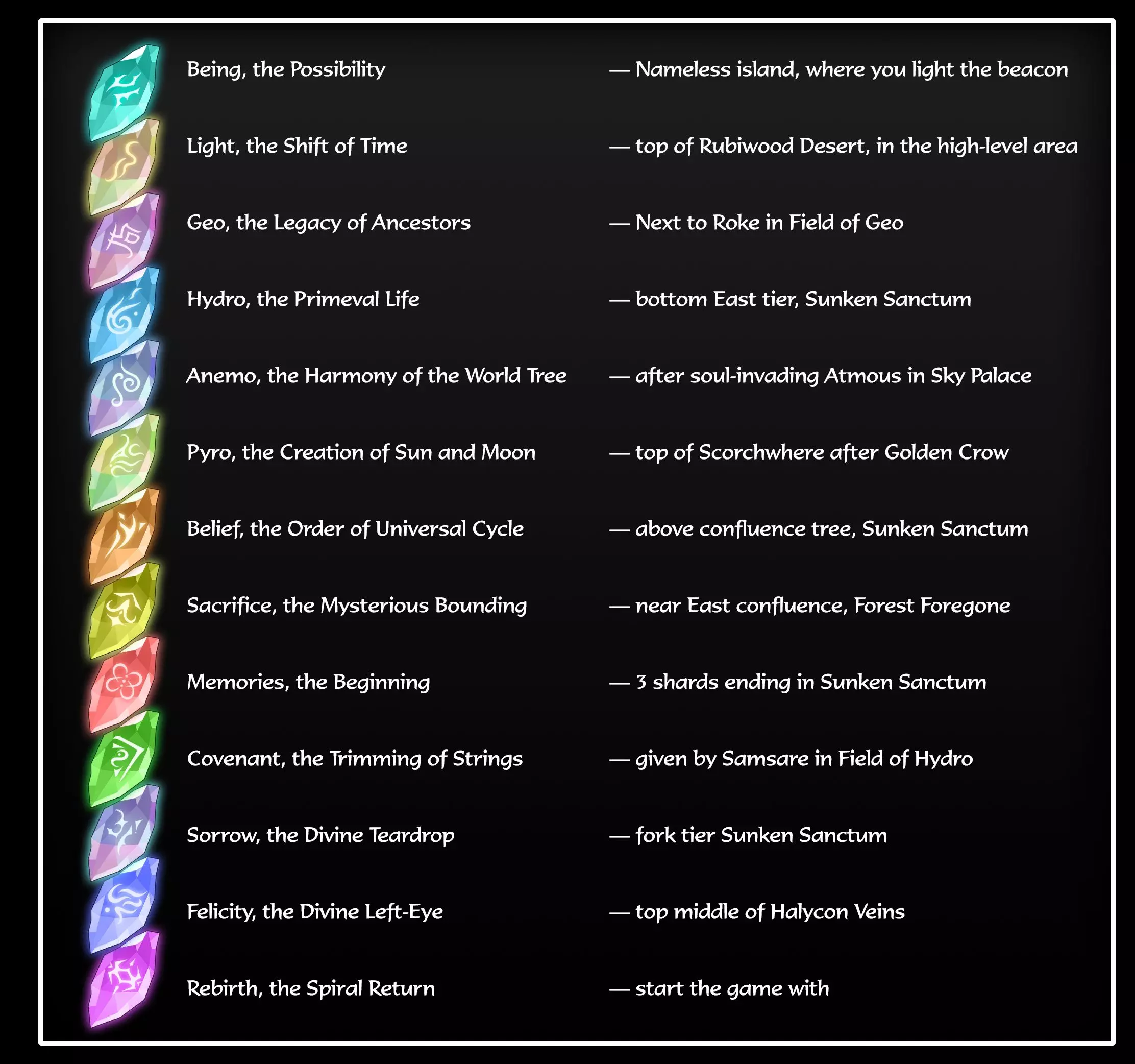 以面具、剑与光环之名。 注:此成就要在完成二周目模式后才能达成。 注:此成就为达成游戏真结局的必要条件。 该成就要求你收集三个额外的残响,它们都会被放置在残响标签页的残响圆环内。前两个可在正常流程中获得,但第三个需完成二周目模式的全部十章后才能获取。 湖之剑 要获得此残响,你首先需要收集全部四块溪流水晶,这些水晶在你获得水下潜水能力后,可在水之领域中获取。以下是所有四块【流晶】的位置: 在【冰封血脉】区域的东南部,有一场与【冰霜骑士伊佐茨】的 boss 战,击败他后会掉落一块【流晶】。 在【阿尔贝多塔】顶部附近,距离塔顶的 boss 战还有几层的位置,向上路径的左侧延伸出一个方形房间,这个房间内既有一块【流晶】,也有一块【记忆碎片】。 当你从【歌利亚陨落之地】获得能够穿过红色屏障的【绯红披风】后,返回【宁静血脉】。在瑟沉睡的巨大开放宝藏区域左侧,有一道红色屏障,冲刺穿过它就能找到源流水晶。 最后一块源流水晶位于怒脉。要进入该区域,只能通过焦土之地或烈焰原野最西端的渡船夫。无论选择哪条路线,都会找到船上的渡船夫。与他对话并购买船票,他就会提供前往多个地点的选项,其中就包括怒脉。航行到那里,最后一块源流水晶就在等着你。 集齐四块源流水晶后,前往脉之核心。在传送点“汇流”的左侧,有一把剑插在地面上,旁边有金色光芒。与剑互动,它会尝试对你进行灵魂入侵。战斗并击败 Boss,你将获得【湖之剑】。 【创世纪光环】 在【遗忘森林】的最东端,它有两处与【寂静海岸】相连。在南端的水域中(你需要具备水下活动能力),有一只可以互动的巨龟。目前尚不清楚推进该任务的确切条件,但社区普遍认为你至少需要达到 75 级。与它对话后,它的背上会出现一道新的金光。跳上去与之互动即可获得【创世纪光环】。 【傩面具】 获取该物品需要你先通关【二周目】模式。完成后,重新加载你的普通存档,前往【白化之塔】,使用与进入二周目相同的传送器传送到【黑化之塔】。一路到底部,再次与卡琳战斗。击败她后你将获得一块面具碎片。与站在那里的42互动,会开启一个新任务。回到圣地顶部的猫头鹰处,位置在传送点“汇流”上方左侧的房间里。现在传送到“水之领域”,去和萨姆萨雷(阿洛斯下方中央的巨大生物)对话。它会告诉你需要五块面具碎片来修复傩面具。你在旅途中可能已经找到了一些,以下是所有五块碎片的位置: 在流放者小镇,击败 boss 奥斯后获得一块,这块基本无法错过。 在彩虹平原,最西侧“汇流”的右侧是城堡的吊桥,你最初需要向下绕路才能到达。爬上有吊桥的城堡,就能找到一个装有这个面具碎片的宝箱。 在大地图上乘坐蝠鲼时,驶向东南角的岛屿,那是一个无名地点。要进入基地,你需要【泪滴基地钥匙】。如果你还没拿到,只需在【水之原野】与阿洛斯对话,选择让她跟你走的对话选项,她就会给你钥匙。进入这个无名地点后,向东南方向前进,直到遇到一场 boss 战。击败 boss 就能获得这个面具碎片。 下一个面具碎片需要你在【低语森林】的紫色迷雾区域击败【贡格尔融合体·古神】,以获得【贡格尔之眼残影】。拿到它后,前往圣地,在设施入口外(若传送至圣地,向西走出设施,然后向上并向右攀爬至入口处,与一尊岩石雕像战斗,互动后雕像破碎,你将获得一块面具碎片)。集齐五块碎片后,返回水之领域的轮回处并与之对话。它会修复面具。如果你拥有上述另外两件物品,轮回的任务就会完成,你将解锁此成就(如果没有,你需要再次回来与之对话以完成任务并解锁该成就)。 死亡之诗