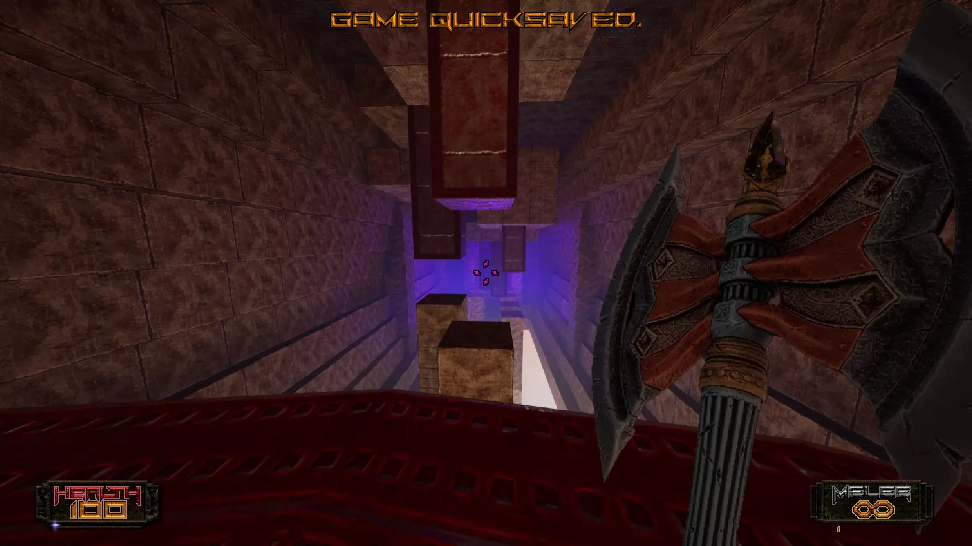 通过4个 crushers(粉碎机关)后,那里会有一个平台,你可以站在上面安全等待。在这里再次存档!接下来的部分是2根柱子,它们会顺时针旋转着穿过平台。不要碰到它们!它们会把你推开(并造成伤害),让你掉下去,然后你会被传送回这部分的起点。这就是为什么我之前说要在这部分前存档。试着把握时机,跳过它们,然后进入它们后面的传送门!