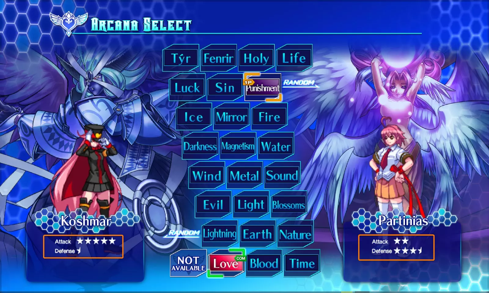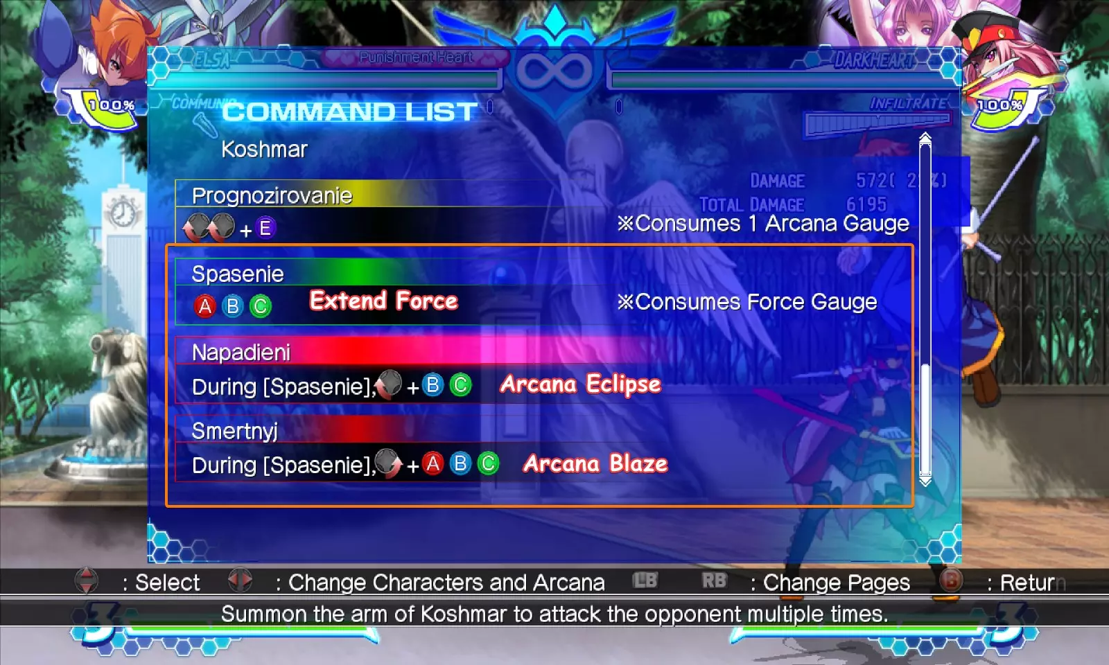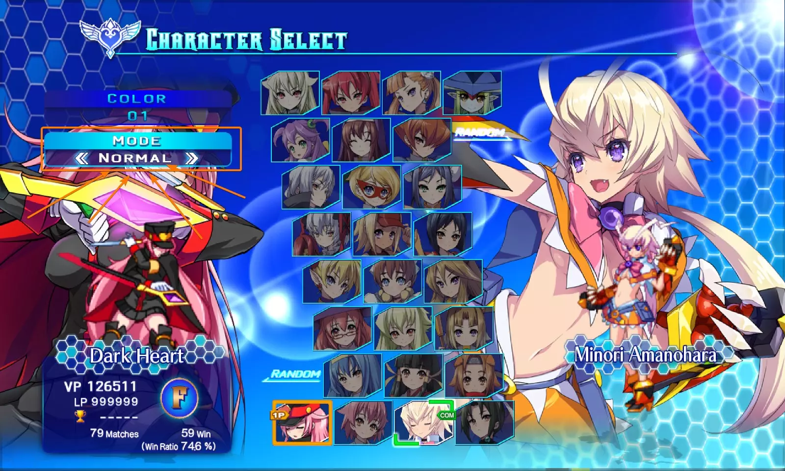 基本信息。角色头像、阿卡纳(Arcana)头像以及你的角色名称会显示在这里。多可爱呀。 你的生命值条。很吓人,对吧?毕竟你得一点点消耗别人的生命值……或者被别人消耗你的。大概就是这么回事。 角色特有计量槽的通用区域。(例如:右侧的暗心(Dark Heart)渗透计量槽。)通常位于生命值条的上方而非下方。 阿卡纳(Arcana)计量槽。这基本上就是你的能量条。 计时器。与普遍认知相反,游戏中的60秒实际上并非现实世界中的60秒。 延展力量(Extend Force)计量槽。一个用于特殊功能的特殊计量槽,稍后会进行说明。 现在你大致了解了各个元素的位置,我们可以继续讲解接下来的内容了。 controls:你可以自定义按键设置。没关系。 我们这里主要讲解宏命令,A到E已经解释了它们的所有功能,但我还是会列出它们。 A - 轻攻击。通常速度较快,但威力较小或判定较轻。 B - 中攻击。介于轻攻击和重攻击之间。通常是好用的牵制技或你会经常使用的普通按键。 C - 重攻击。威力强大的招式。通常速度较慢但伤害很高。对于那些从其他特定格斗游戏转来的玩家,这些按键不能用于使出特殊技的EX版本或发动大多数超必杀技。 D - 追踪攻击。这并非攻击,而是一个让你向对手进行追踪的按键。有点像直接冲向他们。我们稍后会详细讲解。 E - 神符。这控制着你所有与神符相关的内容。你可能会问,什么是神符?不过,我稍后也会详细说明,简单来说就是一套可添加到任何角色的通用招式。E键是使用这套招式的入口。 A+B宏:游戏中大多数超必杀技都通过A+B激活,比如236AB、214214AB、623AB等等。这基本上就是你的超必杀宏。 B+C宏:主要用于发动【奥秘日食】。此外,它也可作为更便捷使用某些连携技和临界之心的途径。我自己没用过这个宏,原因你可以在下面看到。 A+D宏:投掷宏。想抓取对手?按A+D就行。 C+E宏:爆发宏。你可以直接爆发,也就是说不需要在被攻击时也能使用。这意味着如果你设置了这个宏,可能会不小心误按或按错键触发爆发。特此提醒。 A+B+C宏:用于发动【奥秘烈焰】。所有【奥秘爆炎】的指令都是236ABC。所有【奥秘蚀影】的指令都是214BC。所以这两个技能都可以用对应的指令释放。 现在你已经了解了这款游戏的基本操作:A、B、C、D和E键。这些按键组合能触发多种指令,其中大部分与追踪相关。不过我们暂时先讲到这里,接下来我们可以进入更有趣的内容了。 基础机制讲解 - 奥秘系统 既然已经了解了操作,现在你肯定想进入游戏!去击败对手。 不用再找其他攻略了。和其他格斗游戏一样,击败对手的第一步是选择一个角色。但在继续之前,你还需要了解这款游戏与其他游戏的不同之处。那么! 角色与奥秘 当你首次尝试对战时,你需要先选择一个角色。为了让本指南能始终如一地发挥作用,建议你选择【普通之心】。不是【黑暗之心】,是普通的那个。接下来,当你进入角色选择界面并选定角色后,会看到一个模式选项。