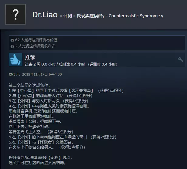 成就 1. 银河铁道 按剧情流程在首发站上车解锁 2. 自由飞翔 在【外围】中与褐色人类对话获得速溶咖啡。 用咖啡研磨机将速溶咖啡还原成咖啡豆。 在帐篷里用咖啡豆泡咖啡。 沿着绳索上台阶,多次与嘴互动可将其踢下去。 然后下去,打碎蛋壳。 等待蛋壳飞上天空。 返回火车时解锁 3. 变成加害者的男人 积分达到3或以上进入终结者地图,终结者左边会出现狼皮地图,交互后解锁 4. 无尽之海 按流程在终点站选择下车,流程至BAD END之后解锁 5. 祝福之声 按流程在终点站选择回程,然后在标题画面进入返程,流程至TRUE END后解锁