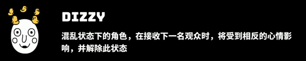 混乱:混乱是个人觉得全游戏中价值最高的正面状态。由于嫉妒这一游戏机制,所谓的“好观众”从收益来讲甚至要低于“坏观众”。因为一个角色获得普通的“好观众”,剩下的两名角色都会掉心情,可谓得不偿失。而游戏里面除了吃食物、使用道具外,唯一没有副作用的回血方法就是在角色混乱的情况下去收获“坏观众”,根据“坏观众”本身的伤害,回复的血量也有不同。到了后期遇到红眼观众,甚至能一次性回满血。保留一个携带混乱状态的角色往往能起到起死回生的效果。唯一需要注意的是在全是“好观众”的情况下,混乱状态也会致命,详见第一关BOSS的打法。