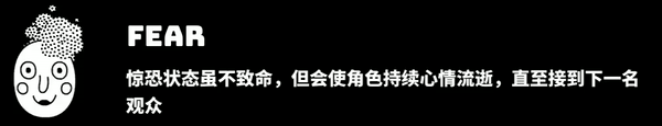 惊恐:惊恐是比较难缠的负面状态,会导致角色持续降低心情值,在新手阶段如果不及时处理,往往会导致角色心情值耗尽。处理方法也比较简单,尽快解除下一个观众的影响。有时候为了尽快摆脱惊恐状态,收获一个【坏观众】也是有必要的。 另外,惊恐状态下心情值的降低速度似乎基于现实中流逝的时间,也就是说在同样的距离下,按J键加速击败敌人会减少心情值的损失。