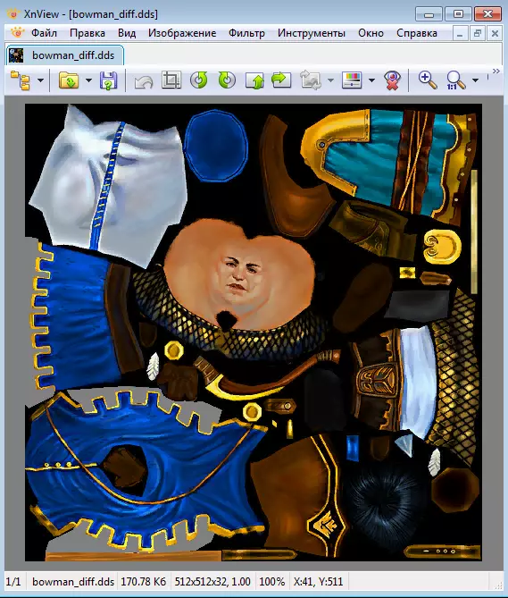 在所有这些数字和字母中,我们要找到所需的纹理名称。在这种情况下,它名为bowman_diff.dds。 第一个.dds格式的文件通常以_diff结尾,是生物的普通纹理。后续文件则与纹理蒙版的闪亮元素相关,目前我们暂时不需要这些。 步骤2. 创建和编辑生物纹理 那么,弓箭手的纹理名为bowman_diff,而我们的模型名为bowman_new.bma。我们该如何打开或修改这个纹理呢?进入游戏目录/data/textures.kfs文件,将其复制并解压到其他位置,提取bowman_diff.dds文件,然后用XnView打开它,就能看到我们要尝试重新着色的那张图片了。