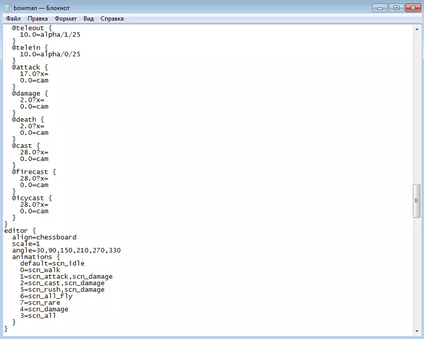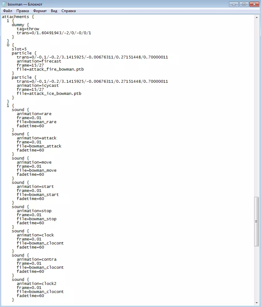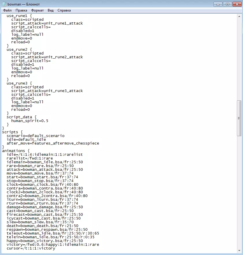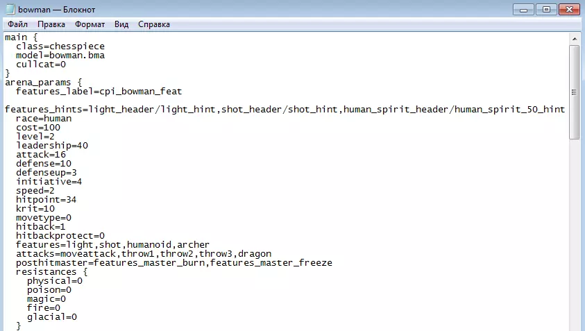通过rus_units.lng文件查找单位的系统名称 现在我们来找到弓箭手的atom文件并确定其模型。为此,在data.kfs和ses.kfs压缩包中搜索“bowman.atom”,为方便起见,你可以按名称对文件进行排序。在这种情况下,我们的文件会在data压缩包中。用记事本打开bowman.atom文件,会看到以下内容: