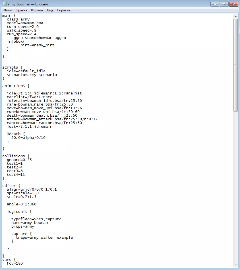 生物原子文件,第6部分 此处列出了该单位模型的动画名称。不建议对此处内容进行修改。 好了,既然您已经了解了.atom文件,现在就可以创建自己的bowman_new.atom了。当然,首先建议您只修改数值,暂时不要涉及脚本。另外,作为描述的模板,应将cpi_bowman_feat修改为cpi_bowman_new_feat。无论如何,您都将获得一个具有新纹理和独特属性的单位,其属性与原版有所不同。 步骤5. 创建生物部队原子 在本部分中,我们将在全局地图上创建单位原子,使其能够作为部队存在。在data.kfs中找到army_bowman.atom文件并复制,将其命名为army_bowman_new.atom。只需用记事本打开该文件,并将模型更改为bowman_new.bma即可。其他设置方面,可以调整单位的行走速度、奔跑速度和转向速度,以下所有设置均为标准值,因此不建议修改。