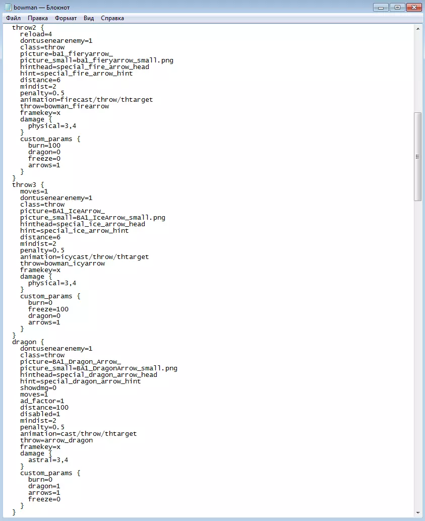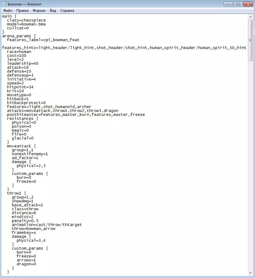 生物原子文件,第一部分 主标签页 class - 显示生物的类别,在本案例中为chesspiece(单位)。其他类别还有throwable(投射物)、hollow(粒子)、pawn(物体)和boss(首领)。 model - 指定生物模型的名称,我们需将其重命名为bowman_new.bma。 spawnscale - 当前模型的尺寸修正值。可以设置为大于或小于1的值,但这会使单位的动画效果变得不标准。建议取值范围为0.9至1.1。blend - 模型不透明度,取值范围为0到1。可用于幽灵和冰系生物,其中0表示模型完全透明且不可见。 cullcat - 单位有效性参数。所有可使用的生物该参数始终为0。 arena_params标签页。 features_label - 指向将我们的单位与loc_ses.kfs档案中具体描述相关联的字符串的说明。features_hint - 指定鼠标悬停时标题/描述格式的文本模板,这也在loc_ses.kfs中进行设置。目前我们将描述留到指南的最后。接下来是一些相当易懂的生物英文特性,我只重点说明那些最不明显的(并非此文件中都有,但存在于其他单位中)。movetype - 单位在战场上的移动类型。标准值为0,即步行移动。还可以设定飞行等级(1)、飞行(2)和幽灵飞行(-2)。 反击 - 单位的反击能力。不反击(0)、仅反击一次(1)、总是反击(2)。 反击保护 - 敌人会对攻击进行反击(0)和敌人不会对攻击进行反击(1)。 真实死亡 - 整个部队死亡后,战场上会留下生物尸体(0)或不会留下(1)。 特性 - 单位在游戏代码中的特性。用于确定施法、效果等能力。ondamage - 该生物部队被消灭后触发的效果,例如 - troll statue( troll statue)。 posthitmaster - 该单位造成伤害(或执行特定行动)后触发的效果。例如 - 中毒、眩晕、恐惧。 posthitslave - 该单位受到伤害(或被执行特定行动)后触发的效果。例如 - 刽子手的额外行动、青铜兽的尖刺、腐烂僵尸的分解。each_turn_script - 当该单位开始行动时所发生的效果。例如 - 再生或净化。 attacks - 基础攻击和天赋的列表,用逗号分隔。每种攻击在本文件下方有详细描述,且附带一个用于AI行为模式的加成。 resistances - 对每种伤害类型的抗性。在《国王的恩赐:黑暗面》中共有6种伤害类型,如果在单位数据中未指定某类抗性,则游戏中该抗性默认值为0%。 现在来谈谈生物自身的攻击。每个单位都必定至少拥有一种对其他生物造成伤害的基础攻击方式,远程单位则拥有两种及以上的攻击方式。 group 1,1表示这是第一种基础攻击,在这种情况下为近战攻击。 group 1,2表示在特定条件下的基础攻击,即附近没有敌人时。 custom_params是特殊的数值或文本值,脚本将读取这些值用于该攻击。用于不同生物的通用脚本——例如,设置攻击后不同的中毒几率。 class - 攻击类型。存在近战基础攻击moveattack、无限射程的远程攻击throw、法术攻击spell以及其他所有脚本攻击scripted。根据攻击类型的不同,技能会请求不同数量的信息。好的,moveattack 默认生效,throw 需要设定射程、投射物、惩罚等内容,对于 spell 和 scripted 类型,需要指定脚本函数和条件。 4.2. 单位原子文件结构