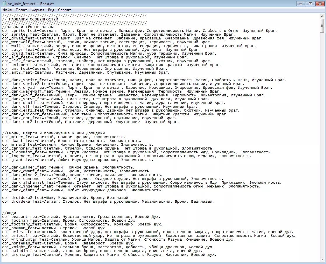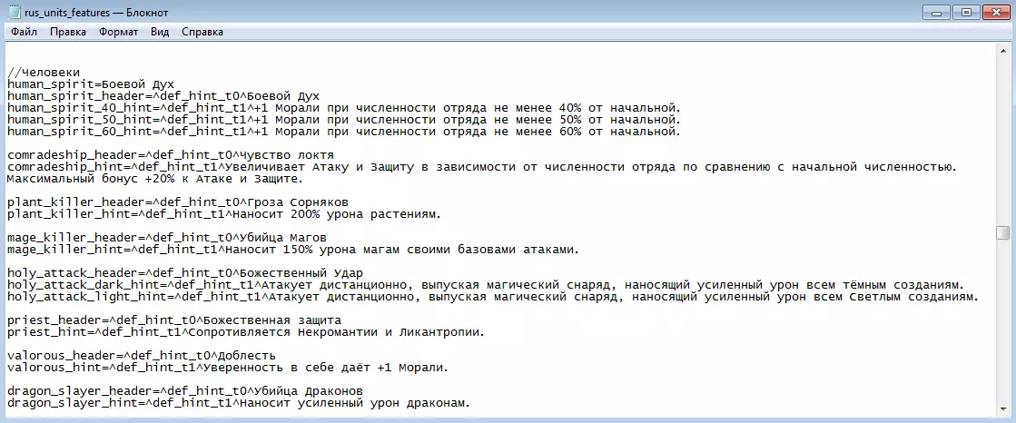 文件rus_units_features.lng的外观 在此只需添加一行【cpi_bowman_new_feat=光明,射手,战斗之魂。】,该行将对应新的单位特性描述。如果您想查看或修改将鼠标悬停在特性(例如【战斗之魂】)上时显示的内容,可以在同一文件中找到以下内容:
