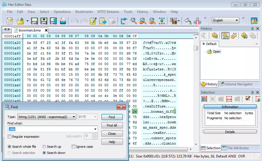 根据单位原子文件确定单位模型。在这种情况下,我们需要的模型是bowman.bma。这里我们关注文件的开头部分,从中可以看到弓箭手模型名为bowman.bma。该名称不一定与单位的标准系统名称一致。前往以下路径:游戏文件夹/data/models.kfs,在压缩包中查找bowman.bma文件。在当前阶段,务必对压缩包进行备份,并将其解压到其他位置,以便单独提取文件。假设你的新单位名为bowman_new,相应地,其模型将命名为bowman_new.bma(bowman.bma文件的副本)。使用十六进制编辑器打开事先复制好的bowman_new.bma文件,然后在该程序中通过搜索功能输入“.dds”。屏幕上我们将看到以下十六进制格式的文本: