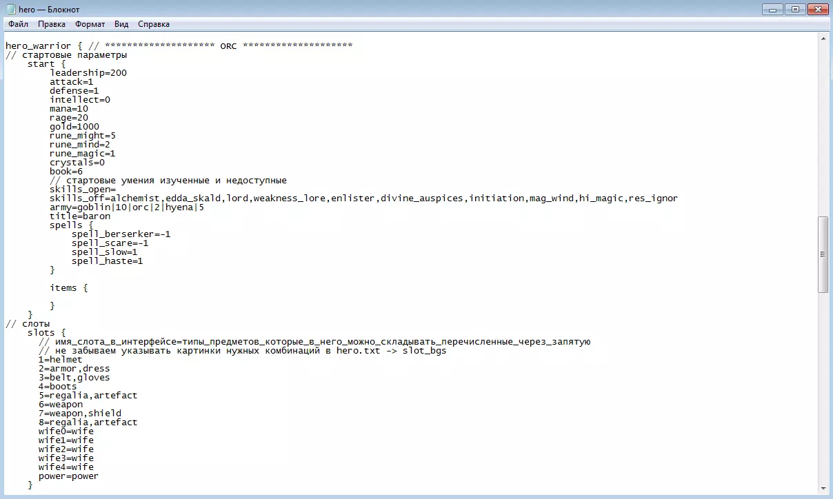 单位特定特性的标题与描述 和其他所有地方一样,header用于标题文字,hint用于具体描述。游戏不会自动修改特性和天赋的描述,因此必须在单位中填写header/hint,然后在cpi_bowman_new_feat中用逗号添加词汇,最后添加与你的header和hint对应的文本。同样,在单位中需要填写天赋的名称和描述:在原子文件中会有它们的英文名称链接,例如special_dragon_arrow_head,而天赋文本本身需要在rus_units_specials.lng中查找。唯一的区别是,天赋还会有一行用于设置标题颜色,例如“special_phoenix_tears_head=^special_tC^[Good]”。 阶段性总结 那么,我们来进行阶段性总结。我们总共需要准备7个必要文件: 模型bowman_new.bma,其内部纹理名称需修改一个字符。 纹理bowmanndiff.dds,可根据您的需求重新着色。 肖像bowman_new.png。 原子文件bowman_new.atom,其特性可根据您的需求修改。 用于全局地图的原子文件army_bowman_new.atom。 用于全局地图交互的文件collision_bowman_new.cms。 loc_ses.kfs中的名称和描述,具体位于rus_units.lng、rus_units_features.lng、rus_units_specials.lng。为了保持既定顺序,请按以下方式将文件放入游戏:将bowman_new.atom和army_bowman_new.atom添加到ses.kfs中,其余所有文件放入data.kfs。如果您已经解压过这些档案,则需要将文件放入同名文件夹。loc_ses.kfs档案仅进行修改,无需解压。 剩下只需在游戏中测试该生物即可。要实现这一点,可以尝试在游戏开始时给玩家该类型的部队:在ses.kfs(事先做好备份)中找到hero.txt文件,会看到以下内容: