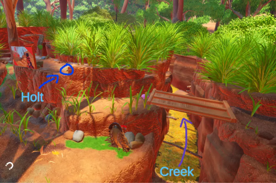 霍尔特是给你发布收集30个 puzzle pieces 任务的 NPC。要找到他,只需前往主枢纽区域中能通往小溪的地方,然后爬上这个带有广告牌的岩架。
