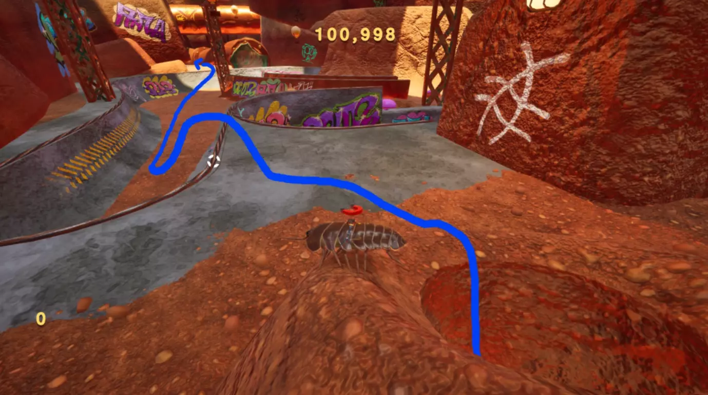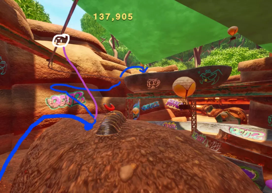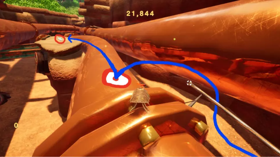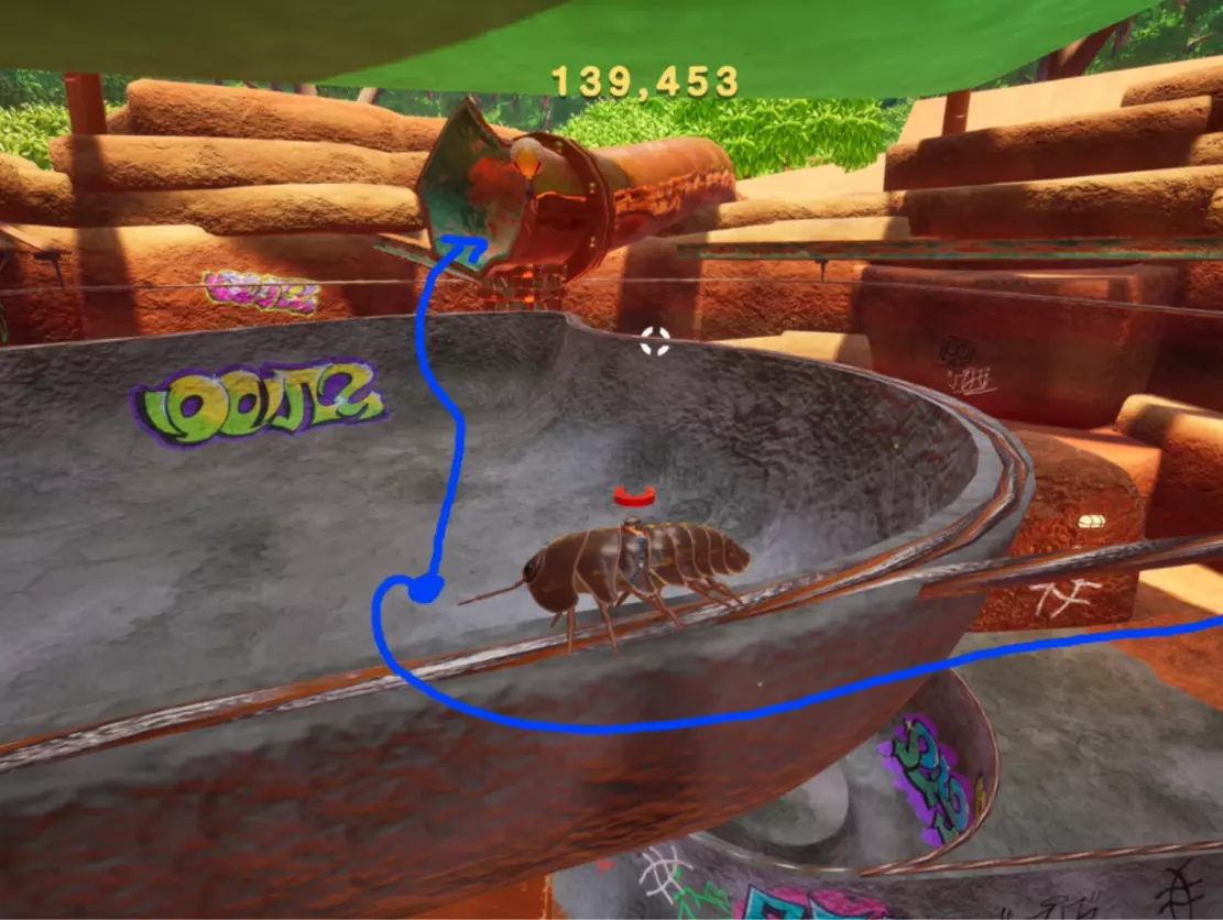 尝试用磁铁荡到这个管道上。上去后,沿着管道继续前进,就能找到拼图碎片。 碎片7 - 滑板公园