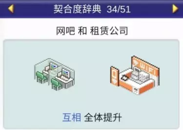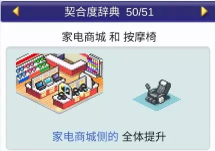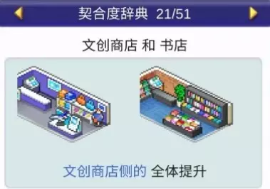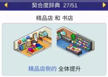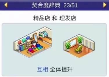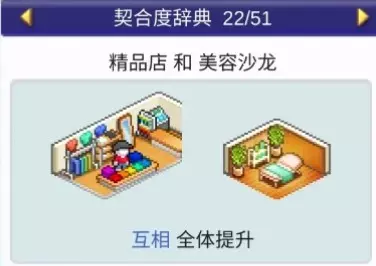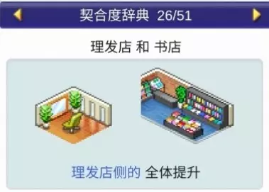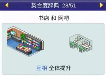 设施1 设施2 效果 书店 文创商店 全体提升 书店 理发店 全体提升 书店 咖啡馆 全体提升 书店 精品店 全体提升 书店 网吧 全体提升 书店 药店 全体提升 书店 足浴 全体下降 理发店(5个提升)