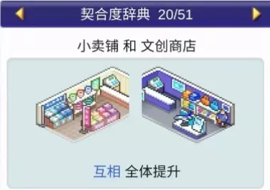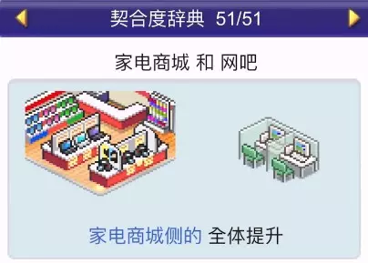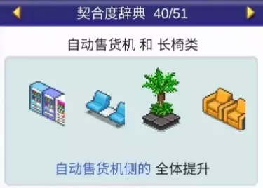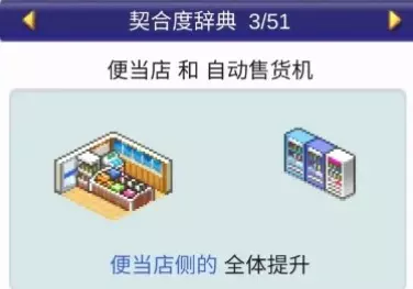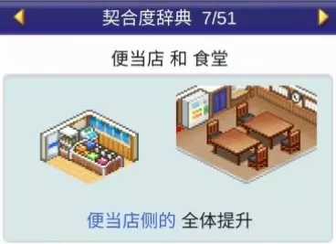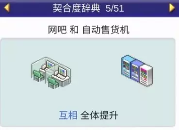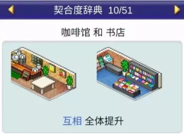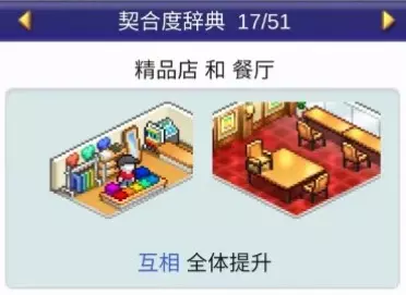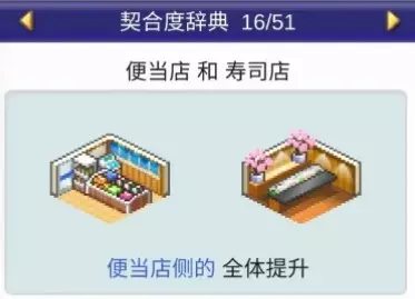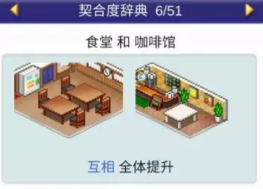设施组合效果: 便当店+寿司店:全体提升 便当店+食堂:全体提升 便当店+甜品店:全体提升 便当店+自动售货机:全体提升 咖啡馆(4个提升效果)