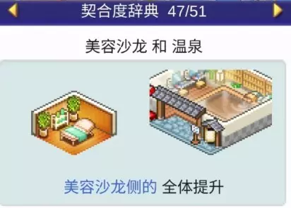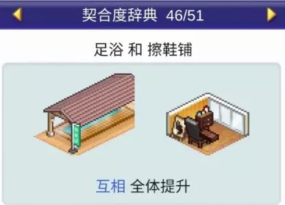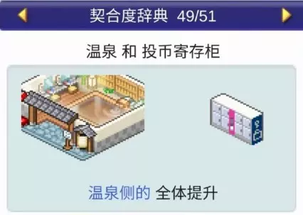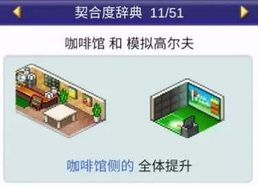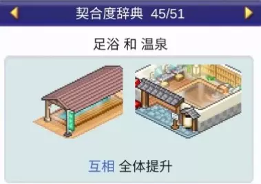 设施1 设施2 效果 咖啡馆 甜品店 全体提升 咖啡馆 模拟高尔夫 全体提升 咖啡馆 食堂 全体提升 咖啡馆 书店 全体提升 温泉 投币寄存柜 4个提升