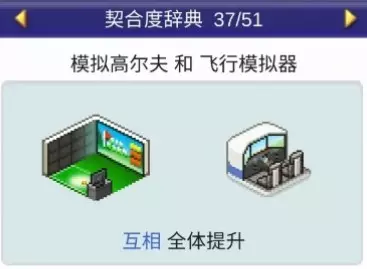 设施组合效果: 飞行模拟器与模拟高尔夫:全体提升 飞行模拟器与神社:全体提升 飞行模拟器与网吧:全体提升 飞行模拟器与娱乐饮品店:全体下降 按摩椅:3个提升,1个下降