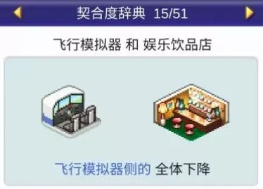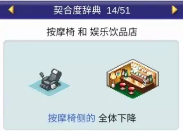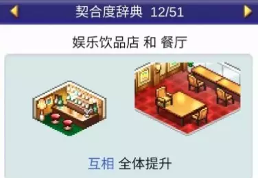 设施1与设施2效果: 娱乐饮品店与餐厅搭配:全体提升 娱乐饮品店与药店搭配:全体提升 娱乐饮品店与飞行模拟器搭配:全体下降 娱乐饮品店与按摩椅搭配:全体下降 甜品店(2个提升,1个下降)