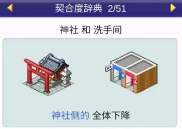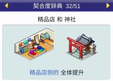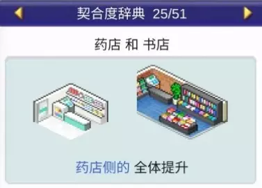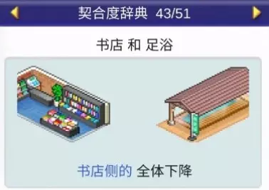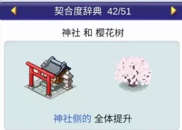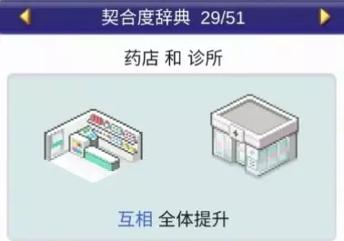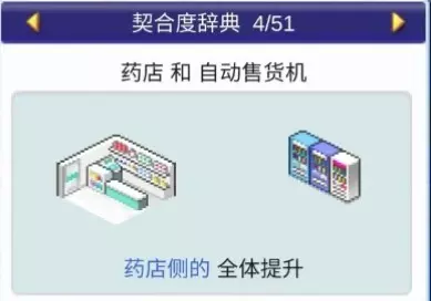 设施1和设施2效果: 药店与书店搭配:全体提升 药店与诊所搭配:全体提升 药店与娱乐饮品店搭配:全体提升 药店与自动售货机搭配:全体提升 神社:4个提升【樱花树】,1个下降