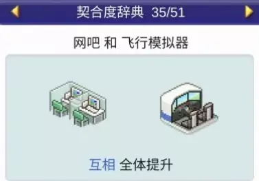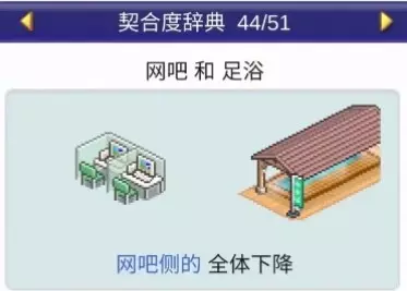 · — ·契合度设施:咖啡馆、甜品店 食物a 食物b 食物c 可丽饼 咖啡 冰淇淋 可丽饼 咖啡 高档巧克力 ❀ 契合度辞典 - 全体提升、下降 ❀ · — 全体提升 —设施组合效果: 便当店+寿司店:全体提升 便当店+食堂:全体提升 便当店+甜品店:全体提升 餐厅+娱乐饮品店:全体提升 餐厅+精品店:全体提升 咖啡馆+甜品店:全体提升 咖啡馆+模拟高尔夫:全体提升 咖啡馆+食堂:全体提升 家电商场+按摩椅:全体提升 家电商场+网吧:全体提升 小卖部+文创商店:全体提升 按摩椅+网吧:全体提升 按摩椅+按摩椅:全体提升 模拟高尔夫+飞行模拟器:全体提升 温泉+理发店:全体提升 温泉+投币寄存柜:全体提升 温泉+美容沙龙:全体提升 温泉+足浴:全体提升 理发店+美容沙龙:全体提升 睡眠室+睡眠室:全体提升 食堂+洗手间:全体提升 书店+文创商店:全体提升 书店+理发店:全体提升 书店+咖啡馆:全体提升 神社+理发店:全体提升 神社+飞行模拟器:全体提升 神社+樱花树:全体提升 精品店+擦鞋铺:全体提升 精品店+理发店:全体提升 精品店+书店:全体提升 精品店+神社:全体提升 网吧+书店:全体提升 网吧+租赁公司:全体提升 网吧+飞行模拟器:全体提升 网吧+网吧:全体提升 美容沙龙+精品店:全体提升 药店+书店:全体提升 药店+诊所:全体提升 药店+娱乐饮品店:全体提升 足浴+瞭望台:全体提升 足浴+擦鞋铺:全体提升 自动售货机+药店:全体提升 自动售货机+便当店:全体提升 自动售货机+网吧:全体提升 自动售货机+长椅类:全体提升· — 全体下降 — · 设施1 设施2 效果 娱乐 饮品店 飞行模拟器 全体下降 娱乐 饮品店 按摩椅 全体下降 洗手间 甜品店 全体下降 洗手间 神社 全体下降 足浴 书店 全体下降 足浴 网吧 全体下降 ❀ 契合度辞典 - 建筑分类① ❀ 网吧(7个提升【租赁公司】,1个下降)