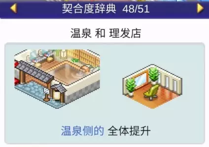 设施组合效果: 理发店与温泉组合:全体提升 理发店与美容沙龙组合:全体提升 理发店与书店组合:全体提升 理发店与神社组合:全体提升 理发店与精品店组合:全体提升 自动售货机(4个可提升【长椅类】设施)