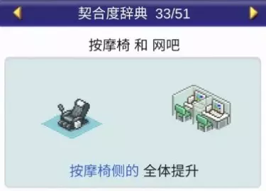 设施1 设施2 效果 网吧 家电商场 全体提升 网吧 按摩椅 全体提升 网吧 书店 全体提升 网吧 租赁公司 全体提升 网吧 飞行模拟器 全体提升 网吧 网吧 全体提升 网吧 自动售货机 全体提升 网吧 足浴 全体下降 精品店(6个提升)