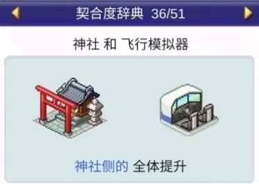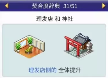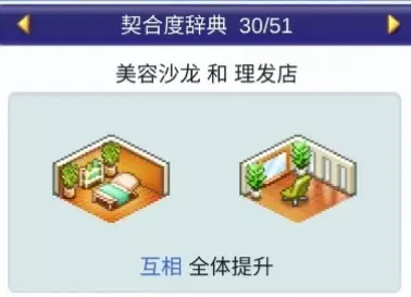 设施1 设施2 效果 神社 理发店 全体提升 神社 飞行模拟器 全体提升 神社 樱花树 全体提升 神社 精品店 全体提升 神社 洗手间 全体下降 ❀ 契合度辞典 - 建筑分类② ❀ 美容沙龙(3个提升)