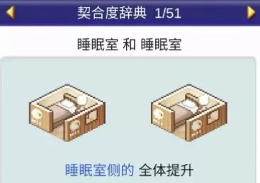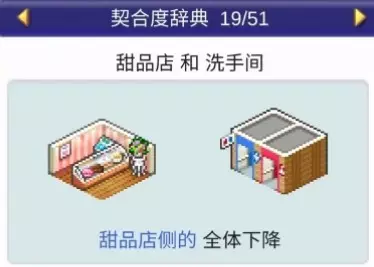 设施组合效果: 甜品店+便当店:全体提升 甜品店+咖啡馆:全体提升 甜品店+洗手间:全体下降 睡眠室:1个提升【睡眠室】