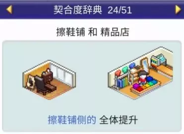设施1设施2效果 精品店餐厅全体提升 精品店擦鞋铺全体提升 精品店理发店全体提升 精品店书店全体提升 精品店神社全体提升 精品店美容沙龙全体提升 书店(6个提升,1个下降)