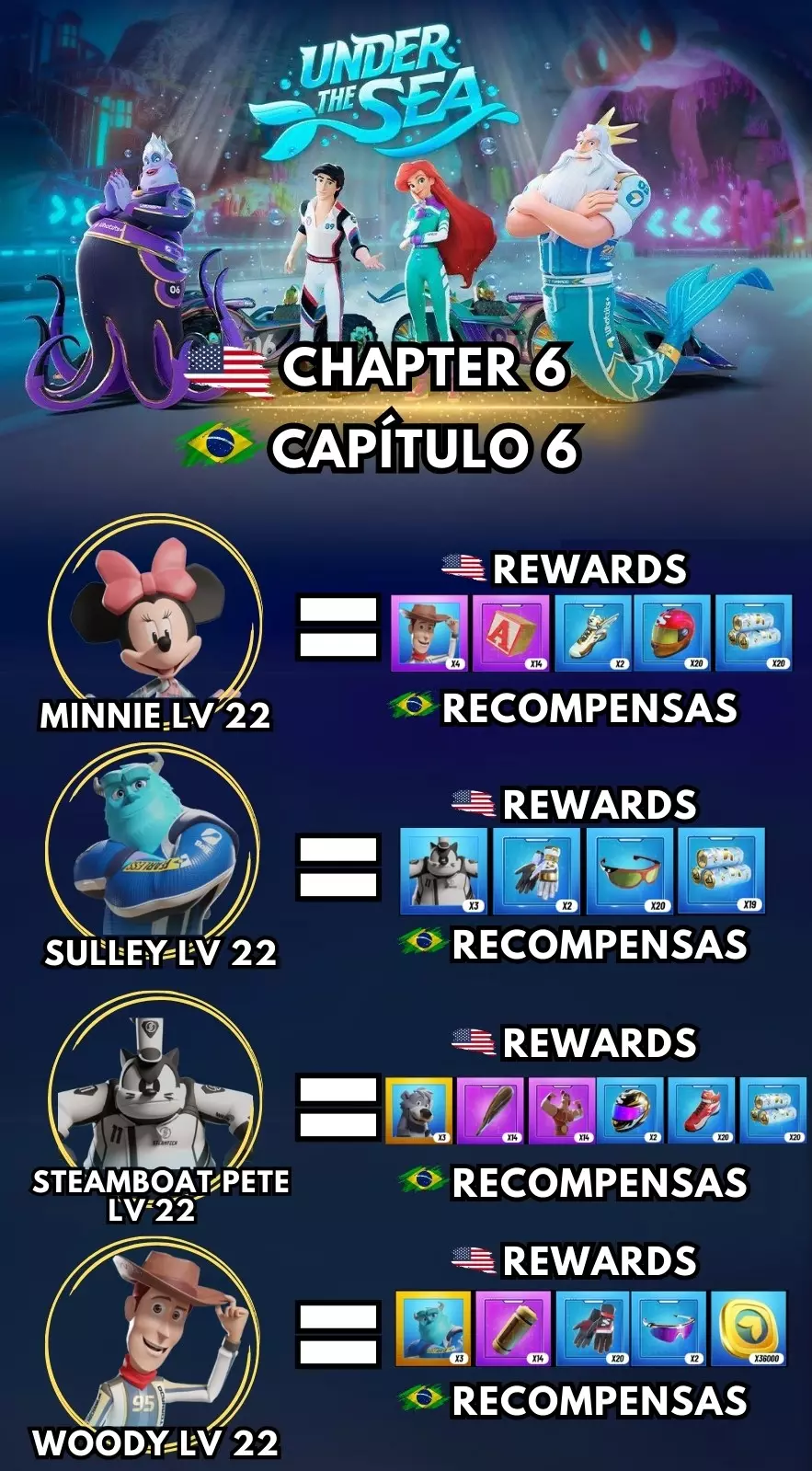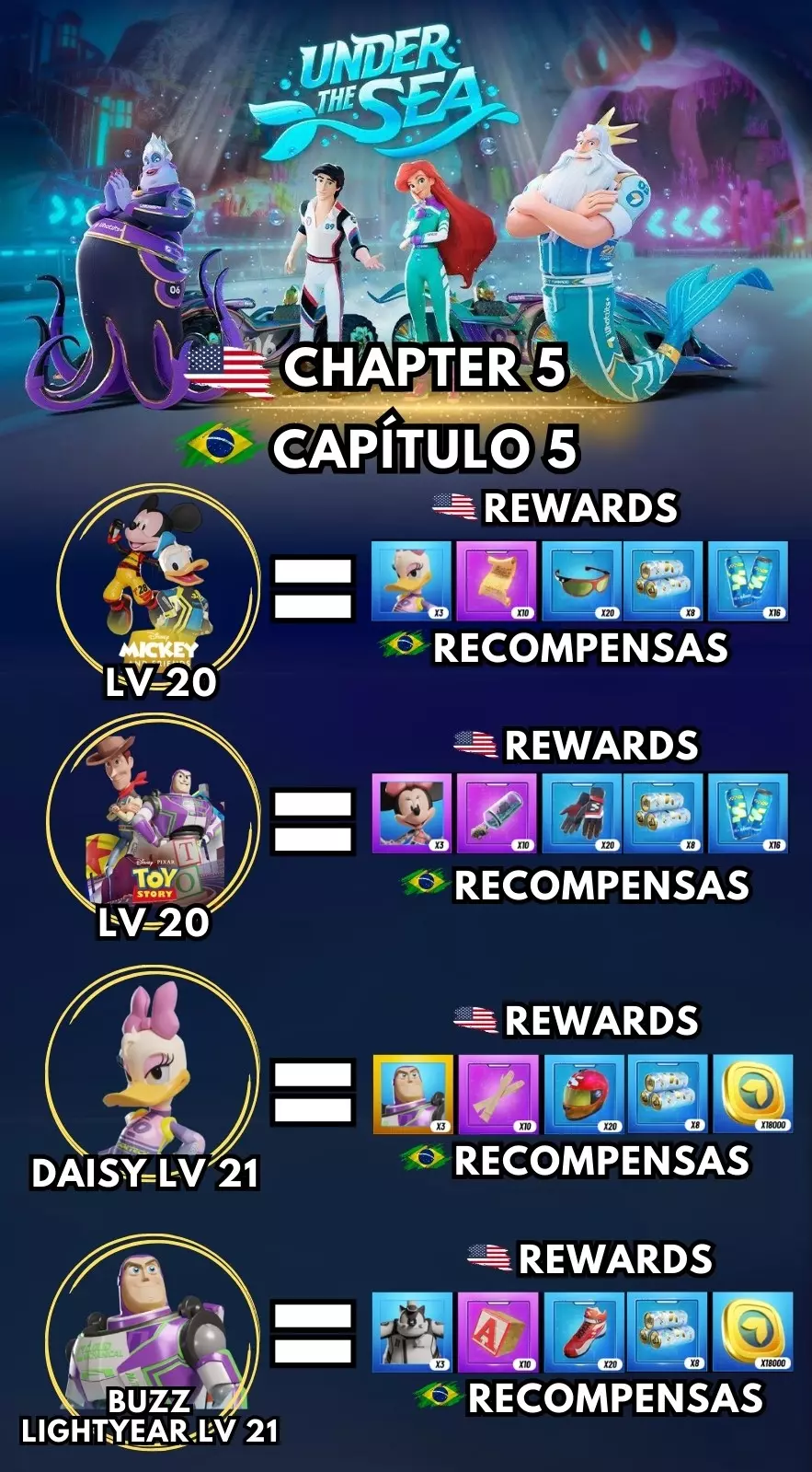 在本指南中,我将为你介绍《迪士尼无限飞车》全新【海底】赛季中获取奖励所需的条件! 本指南包含以下内容: 我会告诉你完成每个章节并获得奖励需要使用哪些赛车手,内容将从第4章开始,一直介绍到第9章!