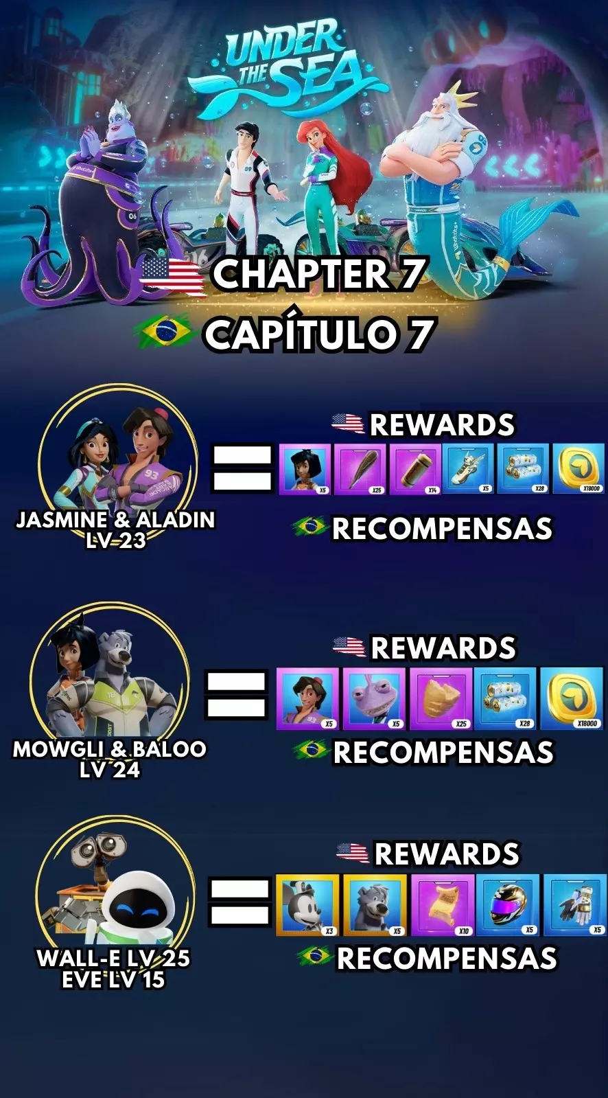 第七章! 茉莉与阿拉丁 23级 - 5个莫格利 莫格利与巴鲁 24级 - 5个阿拉丁和5个兰德尔 瓦力25级与伊芙15级 - 3个蒸汽船米奇和5个巴鲁 故事(主路径)- 5个埃里克 故事(主路径)- 2个乌苏拉
