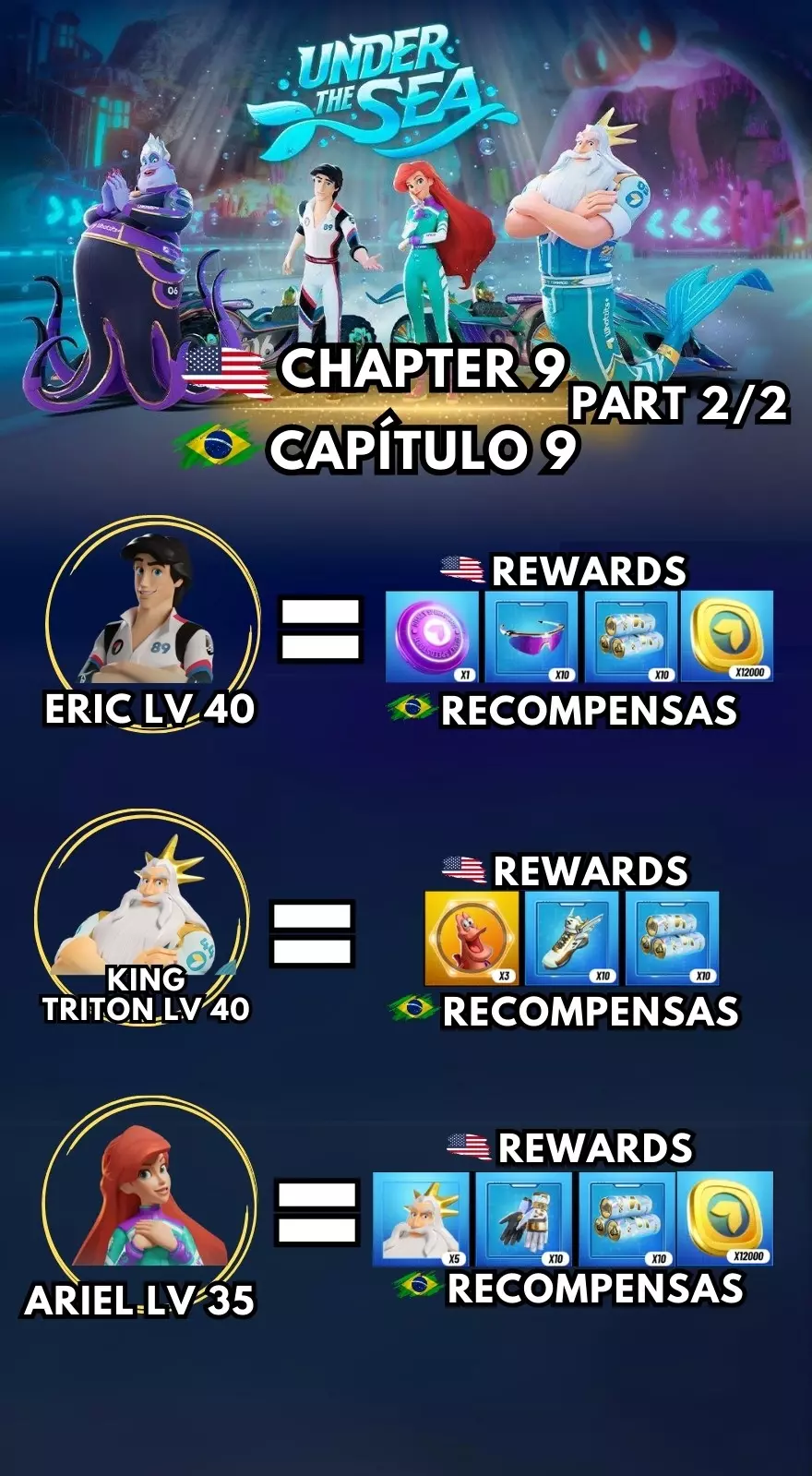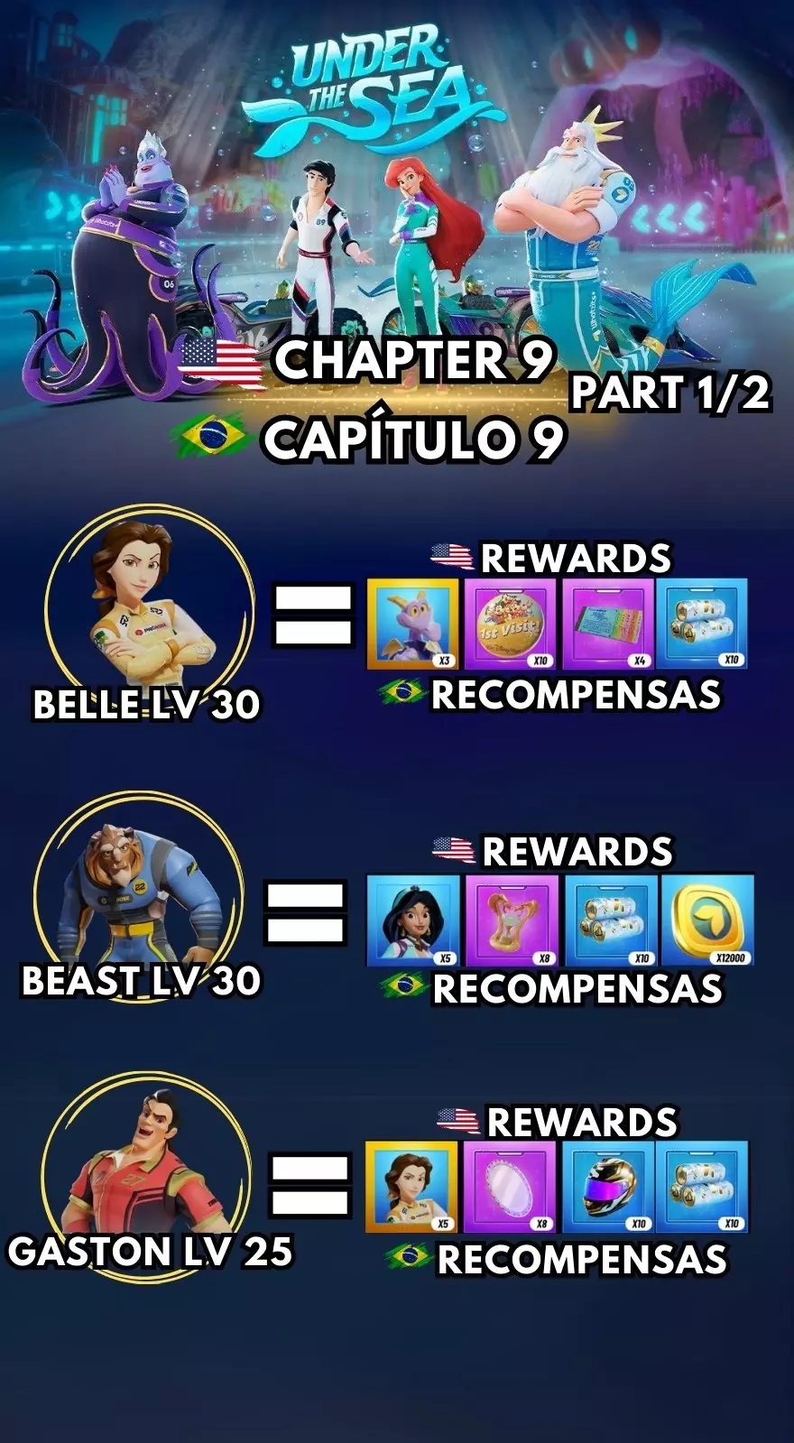 第九章! 野兽 30级 - 5个茉莉 贝儿 30级 - 3个艾幻想 加斯顿 25级 - 5个贝儿 爱丽儿 35级 - 5个川顿国王 川顿国王 40级 - 3个传奇船员 埃里克 40级 - 1个赛季宝箱币 故事(主路线)- 5个埃里克 故事(主路线)- 20个乌苏拉