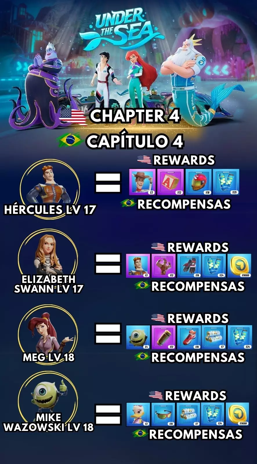 第8章! 莉萝 35级和史迪奇 25级 - 3个哈迪斯 米奇 40级和蒸汽船米奇 25级 - 3个史迪奇 兰德尔 30级 - 5个莉萝 哈迪斯 25级 - 5个加斯顿 故事(主路径) - 5个埃里克和3个野兽 故事(主路径) - 6个乌苏拉