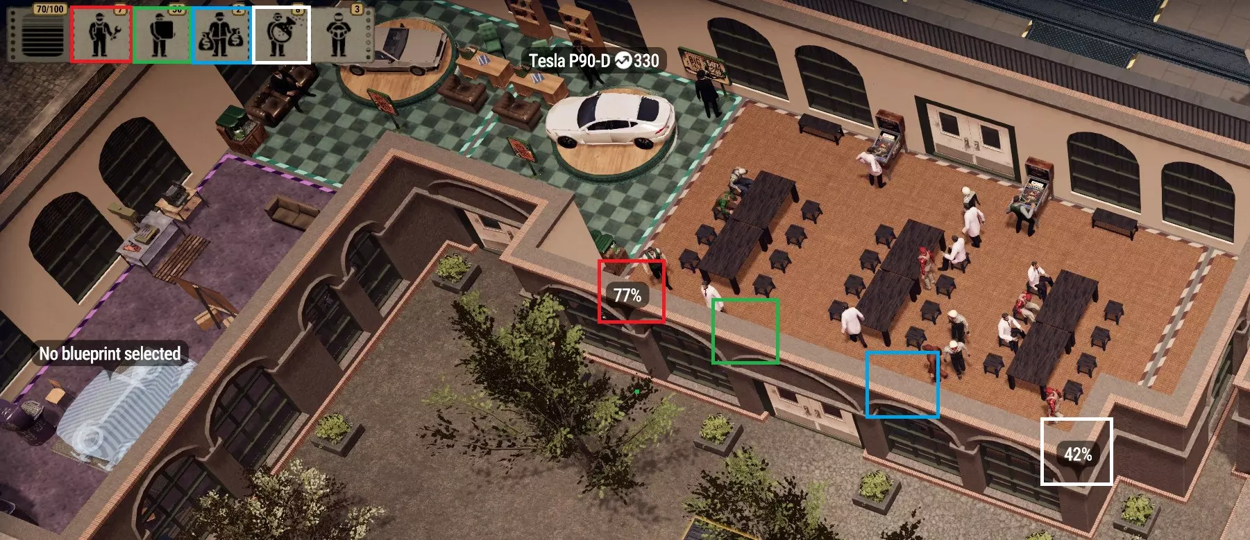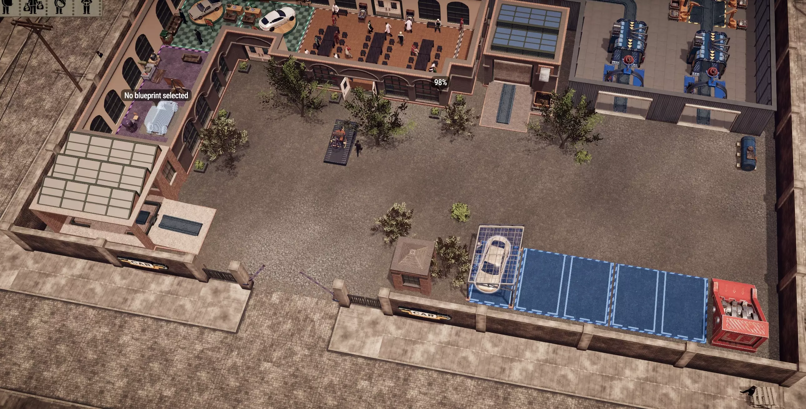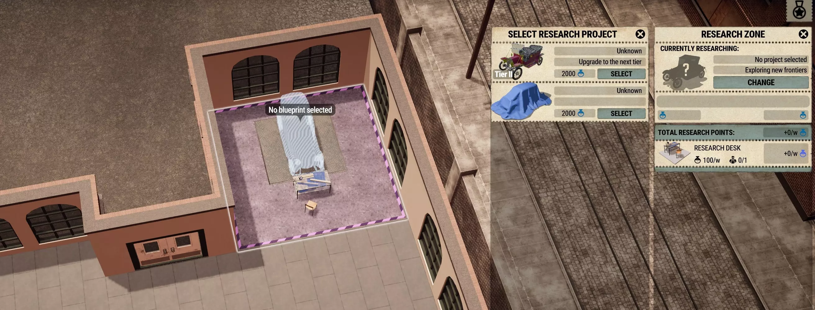 现在客户和司机可以进入展厅和食堂,机械师也可以从食堂前往工厂车间,还为工人设置了专门的零件领取点。 研发方面: 从当前阶段开始,我们需要考虑到游戏中可能没有三级员工可供雇佣,因此有时可能需要取消游戏暂停。 这种情况下,我们不希望浪费任何时间,因为这不仅会消耗银行存款,还会浪费研发时间。 所以,请放置一个研发区域。