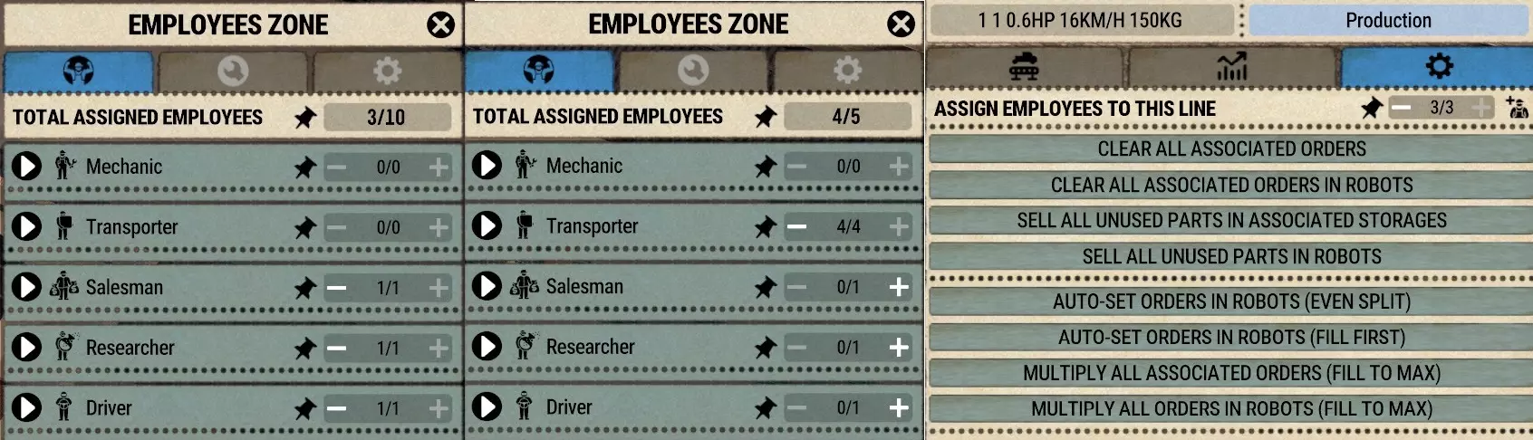 院子前方的空地将用于建造拆解/维修车间、发电机和粉碎机,我会在指南的后续部分展示多种设计方案。 不过现在,我们只需要招募一些员工来启动运营…… 招募员工 接下来我们需要招募以下员工: 1. 1名司机,负责移动车辆 2. 1名研究员,开始研发新车 3. 1名销售人员,负责销售汽车 4. 3名机械师,因为1885年款奔驰最多需要3名活跃工人 5. 4名劳工,负责搬运零件 希望你能在暂停游戏前幸运地招到足够的3级员工,但如果没有,一旦取消暂停,就要不断刷新列表,直到招齐上述所需的10名员工。当所有员工都已雇佣,确保他们都达到三级后,按照相关指南中的信息设定他们的工资。接下来,我们要将四名工人分配到之前放置的储物柜处,将三名机械师分配到生产线,然后将剩余员工分配到食堂。