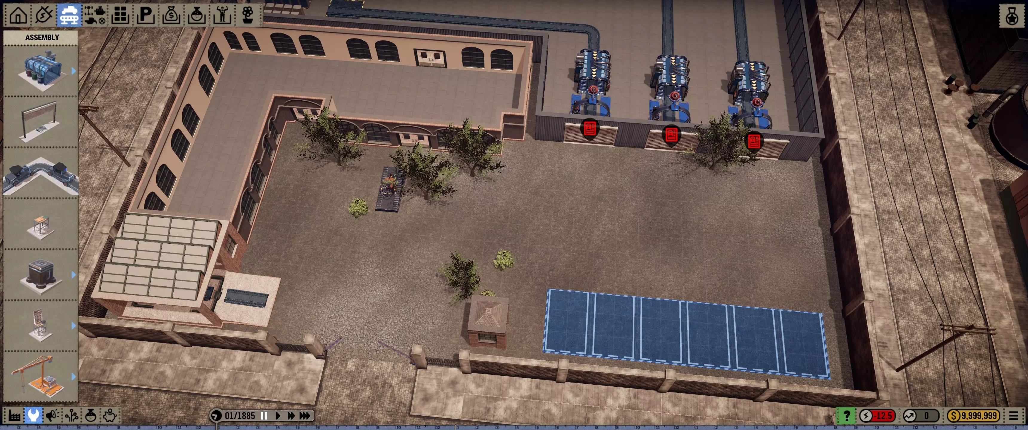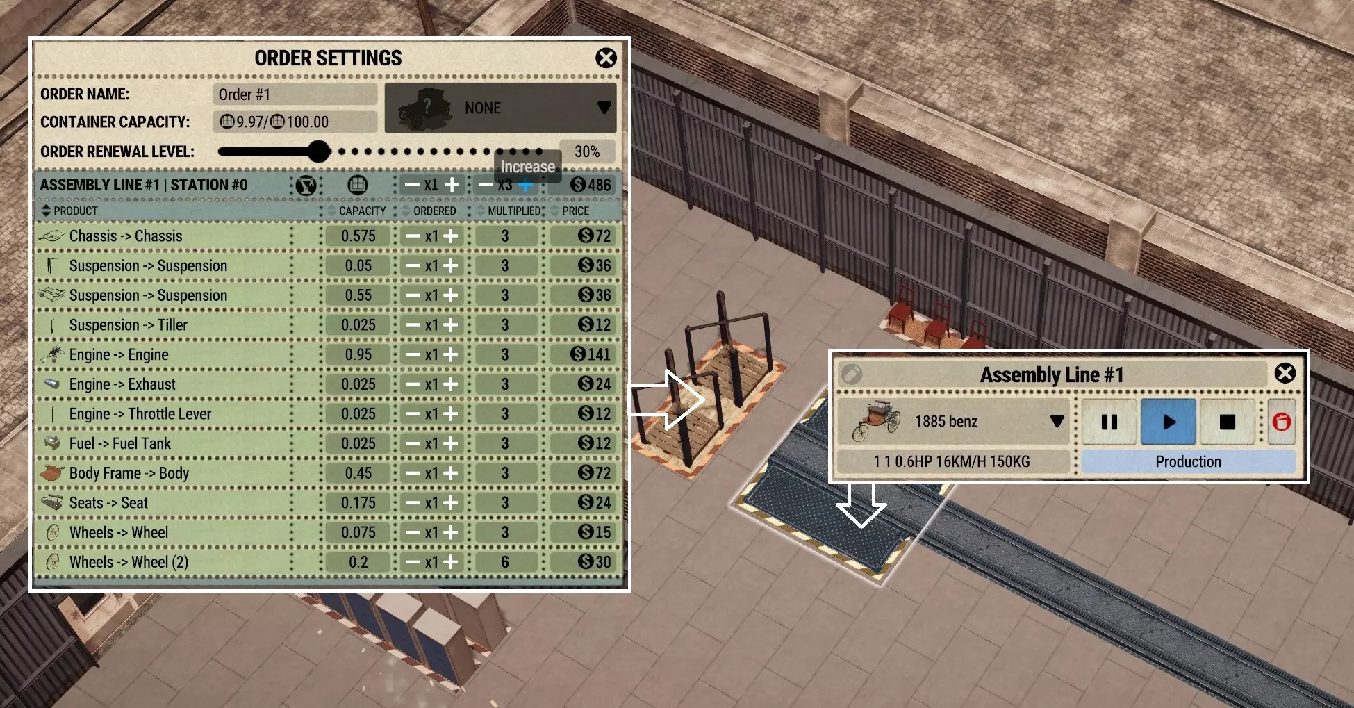 同时,请提交零件订单,数量选择三倍,并选择1885奔驰进行建造,然后点击开始建造。这样,一旦游戏解除暂停,你就能立即开始,不会浪费时间。 销售方面: 建造两组各两个停车位,以及一个单独的停车位……然后将它们布置在右下角。