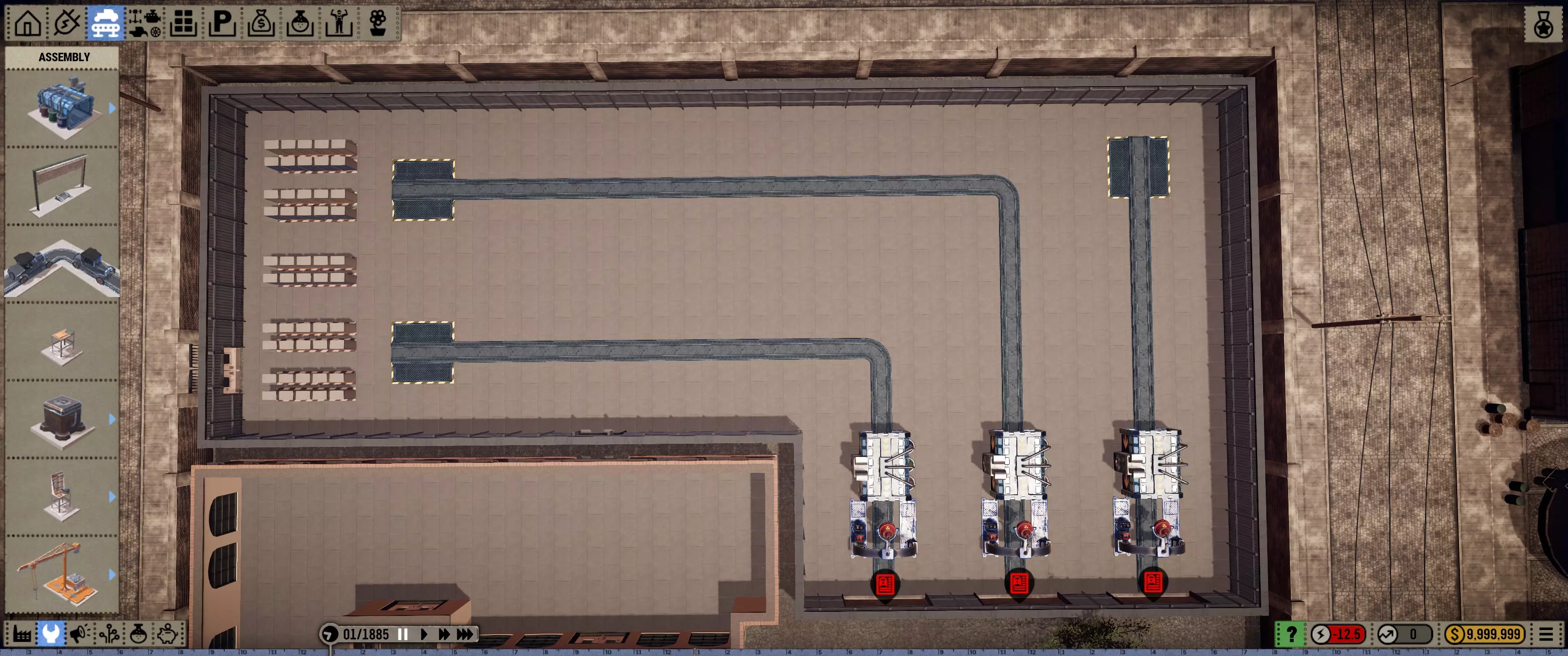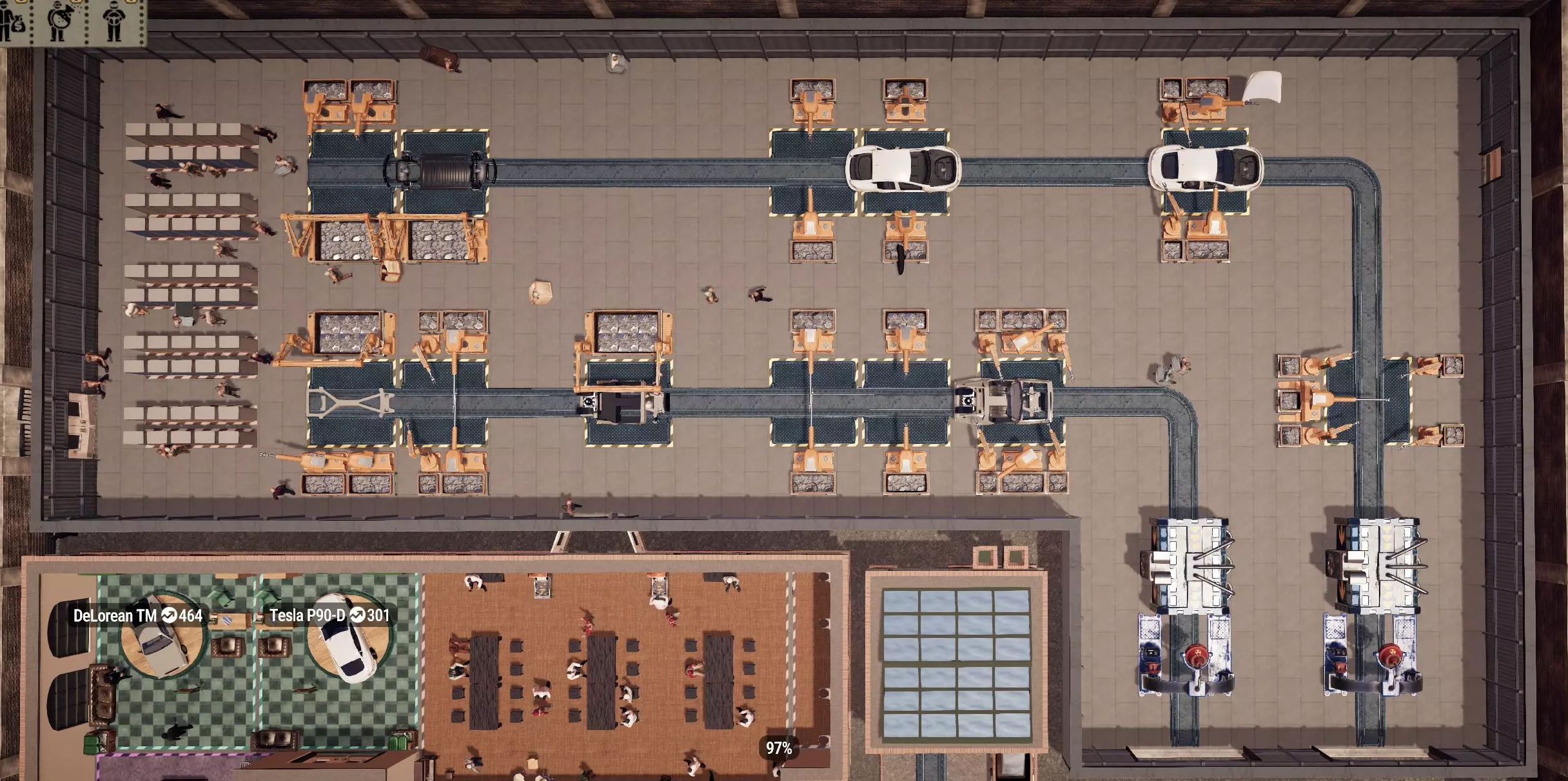 好了,各位,让我们开始这款游戏吧。别忘了,一旦你造好了几辆汽车,就可以发布销售了。最好至少等两辆汽车准备好,以应对发布日的抢购潮。祝好运! 发展建议: 我建议你把生产线增加到三个工位。 同时,为工位配备下一种类型的货架,工位之间留出2格或4格宽的间隙。 留2格间隙可以缩短行走距离,因为对于机械师来说,车轮部件总是需要他们在生产线周围移动,目前这一点无法避免。不过,留4格间隙可以增加在产汽车的数量。 你还可以添加工具工位。