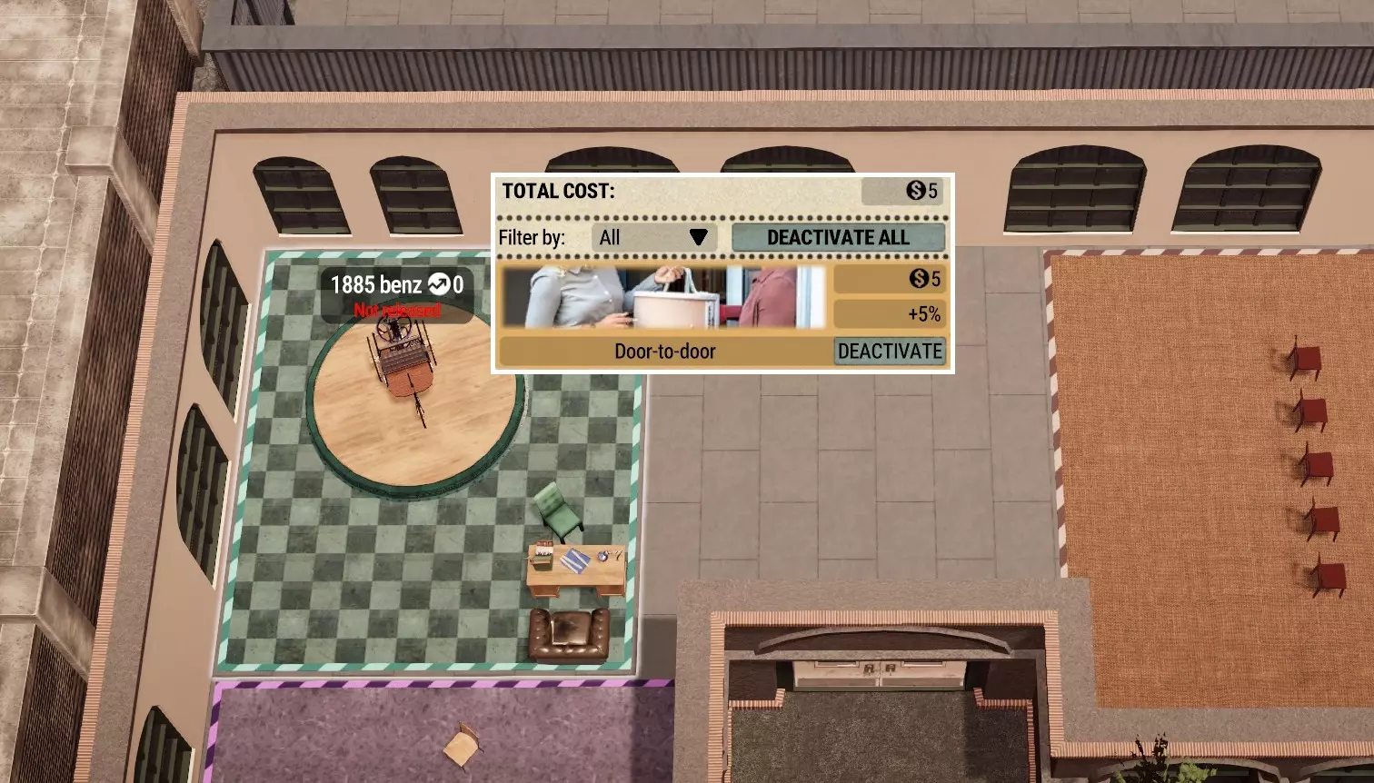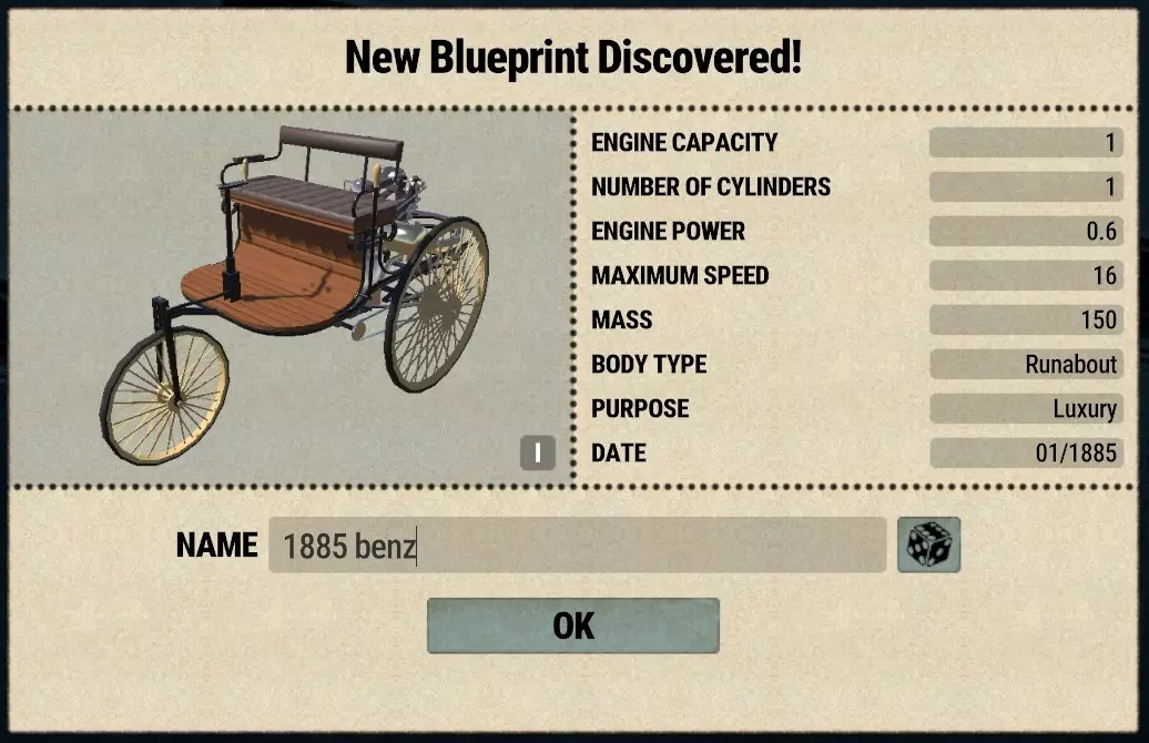 同样地,如果你打算只运营一条生产线,那么就无需设置双销售区域,而是将整个区域都用于单个销售台的布置。 不要忘记在销售槽中选择1885款奔驰汽车,并激活广告功能。这样,当游戏解除暂停后,汽车的知名度就会开始提升。等生产出几辆汽车后,你就可以发布该车型进行销售了。 另外,记得调整价格。我发现将价格设置为250%是一个不错的平衡点,能兼顾利润、销售速度和客户投诉。