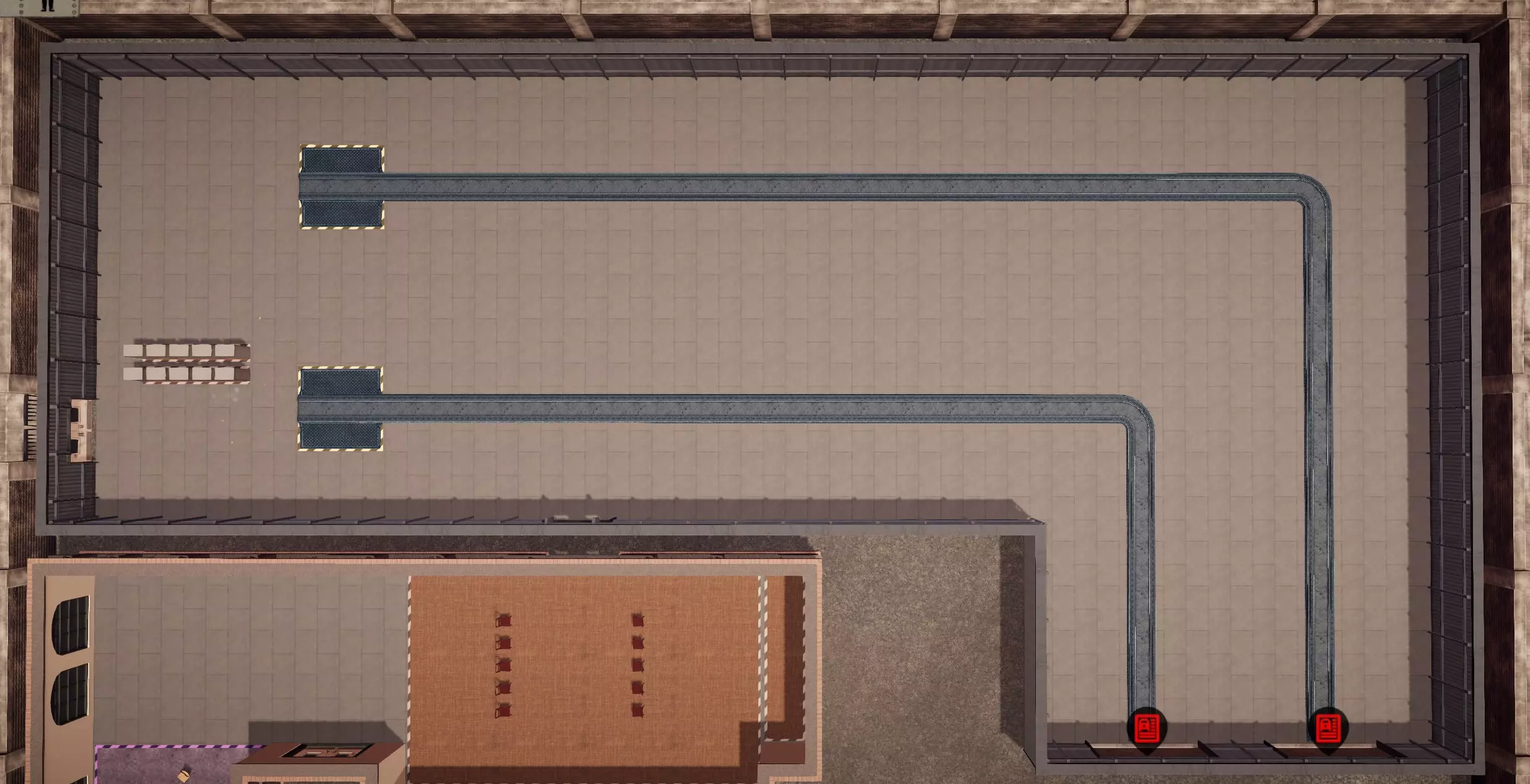 打开研发菜单,升级以下内容: 管理等级1 员工区域 基础休息设施等级1 完成后,你需要做出第一个决定:此设计允许你运营两条生产线,或是一条包含二十个工位的完整生产线。 每条生产线各有优缺点。 游戏后期,单条生产线将允许你拥有一条包含二十个工位的全自动化装配线,提供最大化的生产线设计,但只能生产一种汽车。 一条三个工位的生产线仅依靠机械师就完全能让你顺利推进游戏,而且你随时可以调整,但现在做出决定将节省修改成本。运行两条生产线会更有趣,有时也是更好的选择,因为当你将其中一条生产线更换为另一种车型时,另一条生产线总能持续盈利。不过,你自然无法运行一条包含二十个工位的完整生产线。 我会举例说明这两种选择,并包含设计元素…… 但首先,我们来处理员工路径规划…… 我们将在以下位置设置门: