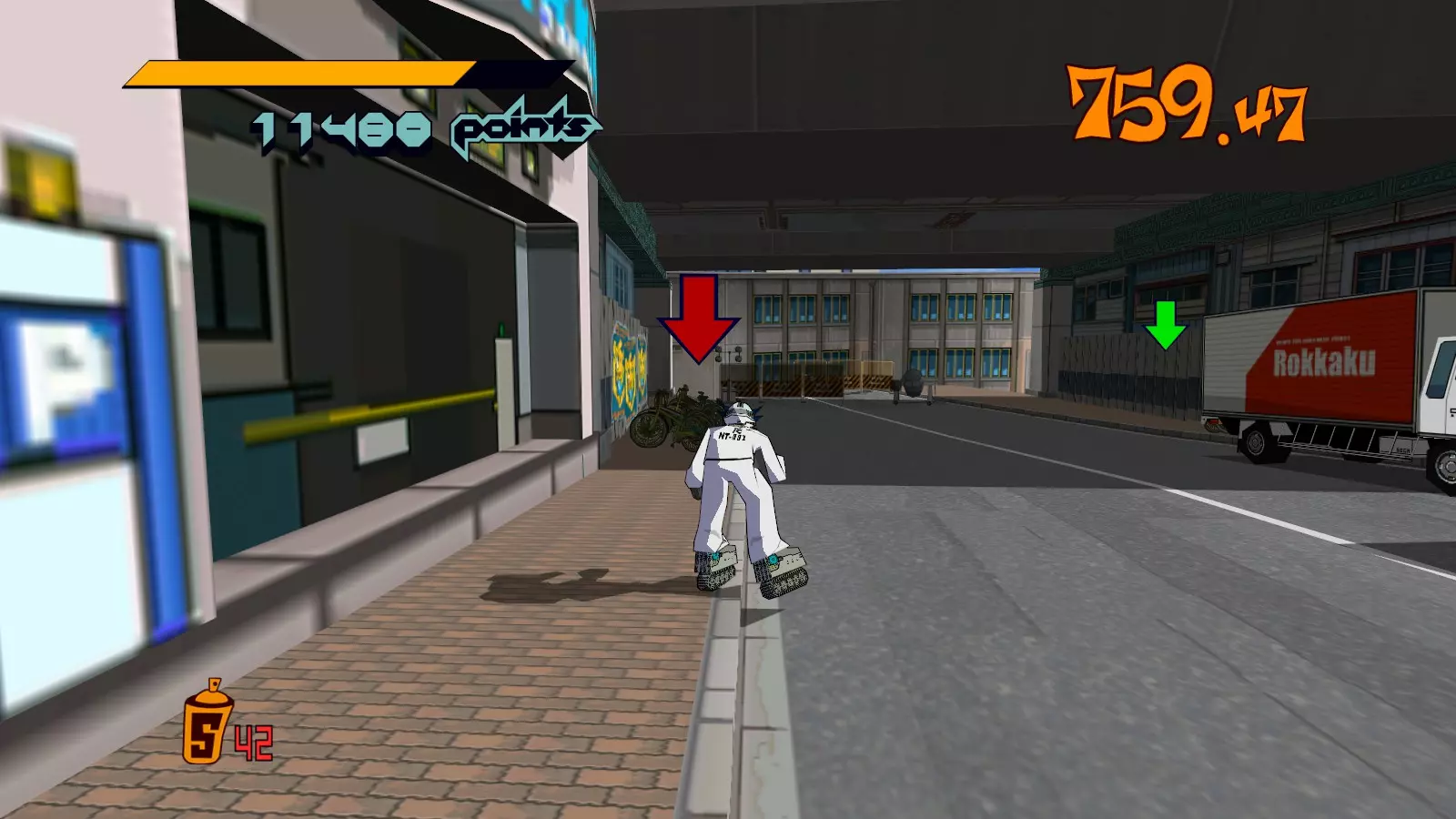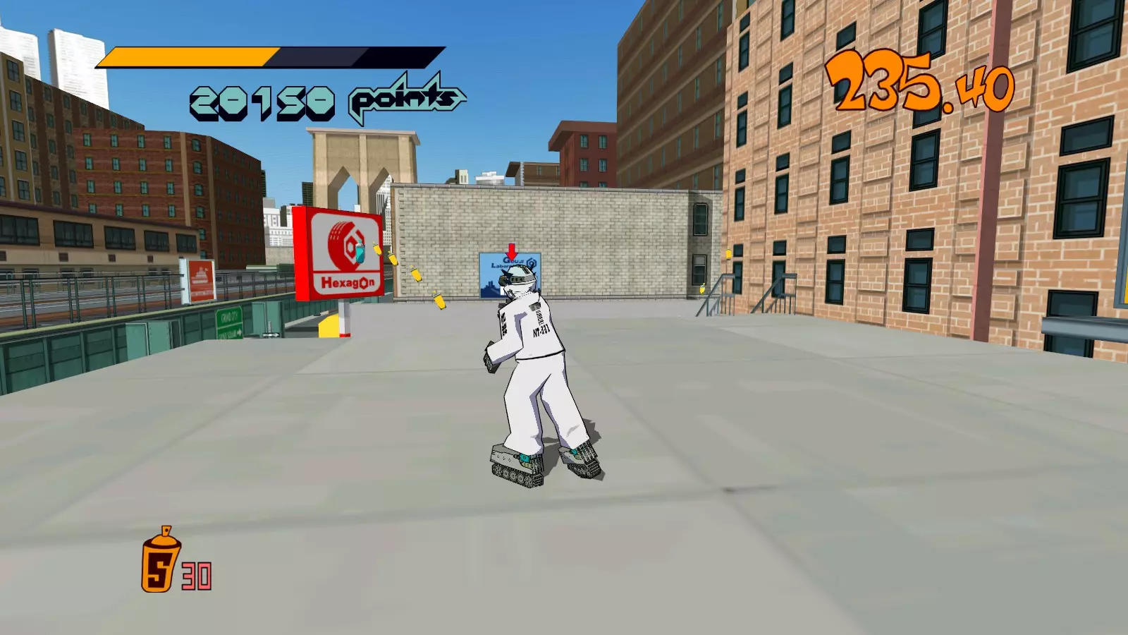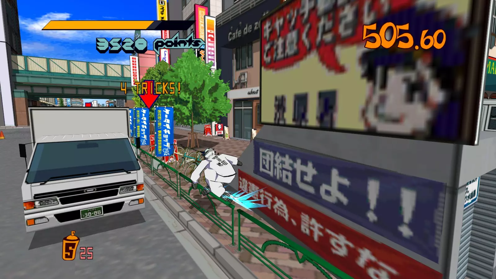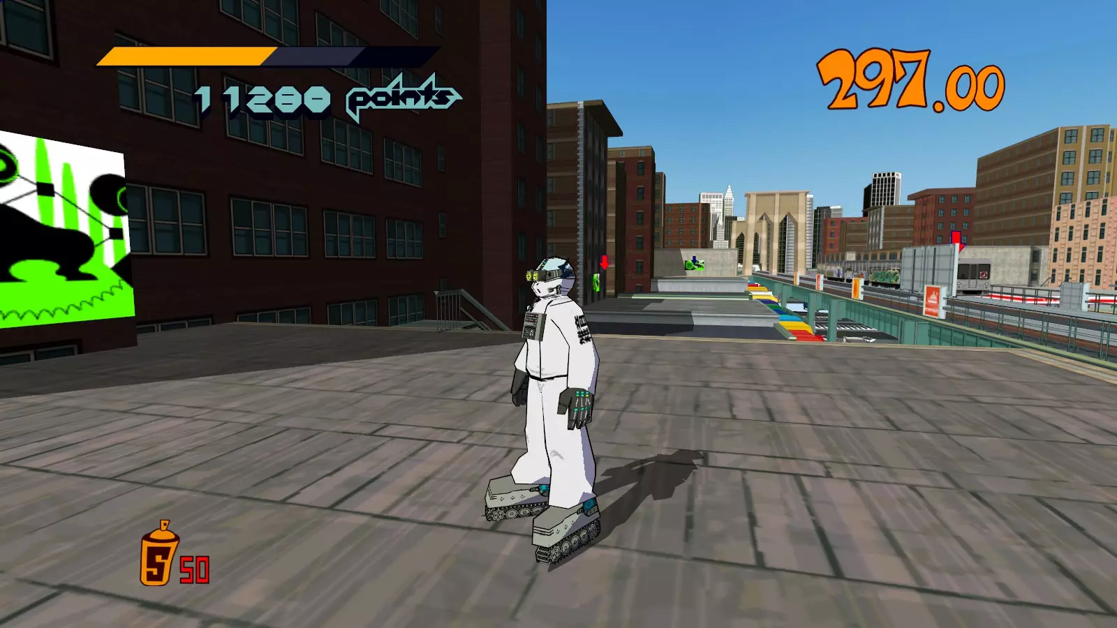 先在你面前的空调通风口处滑行来收集喷漆罐。继续滑行,跳过去攻击那个位于超大涂鸦处的噪音坦克,获取10个喷漆罐。不要喷涂那个超大涂鸦。