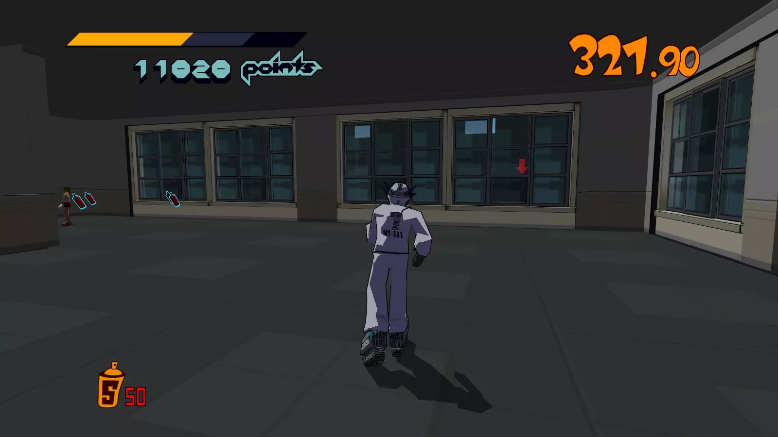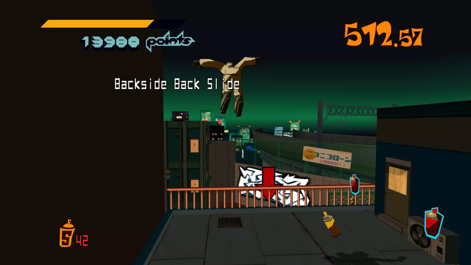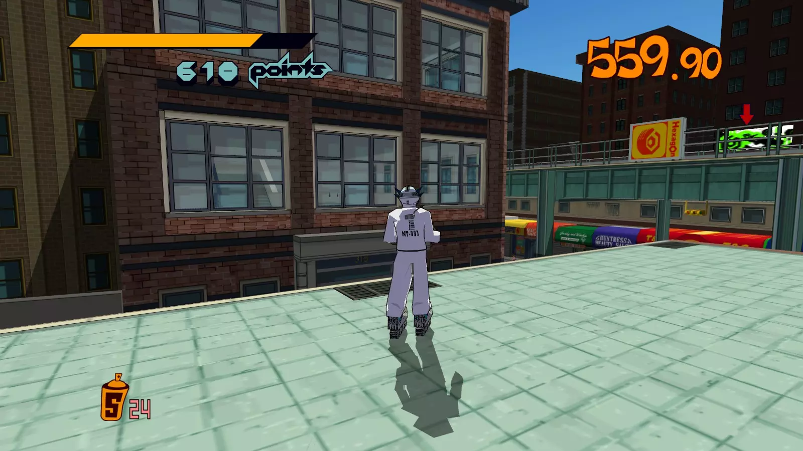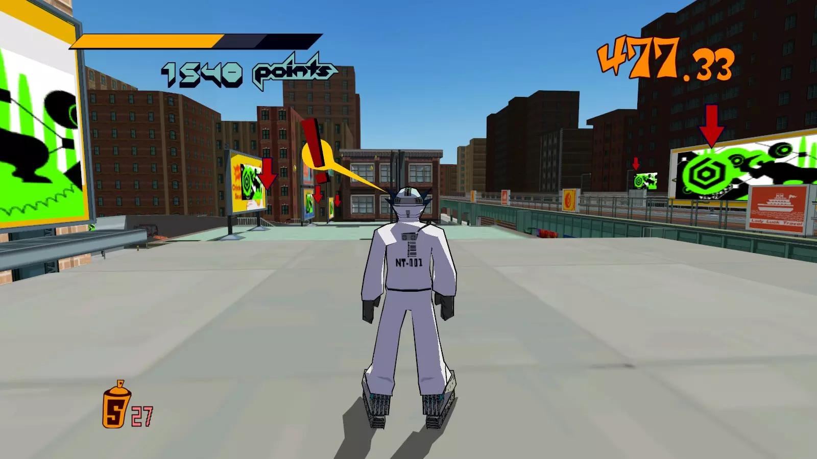 先在你面前的空调通风口处滑行来收集喷漆罐。继续滑行,跳过去攻击那个位于超大涂鸦处的噪音坦克,获取10个喷漆罐。不要喷涂那个超大涂鸦。