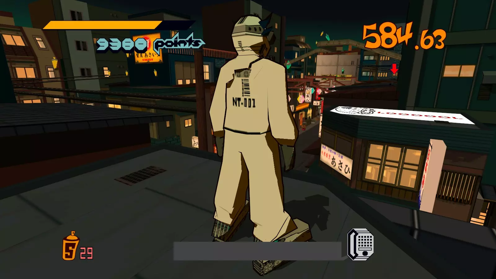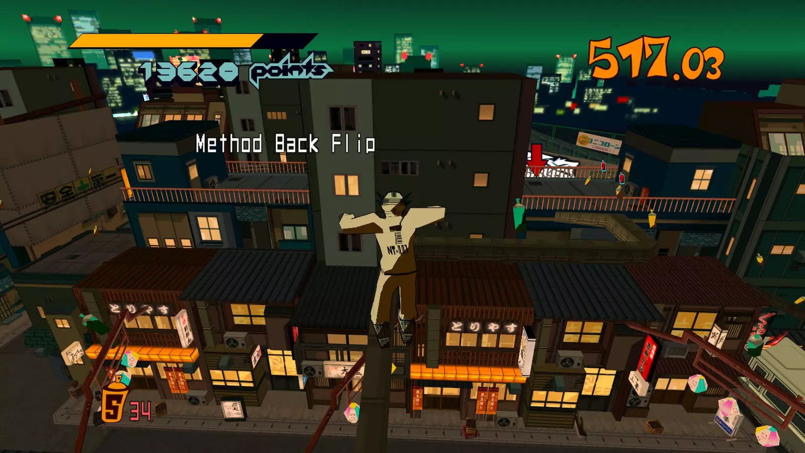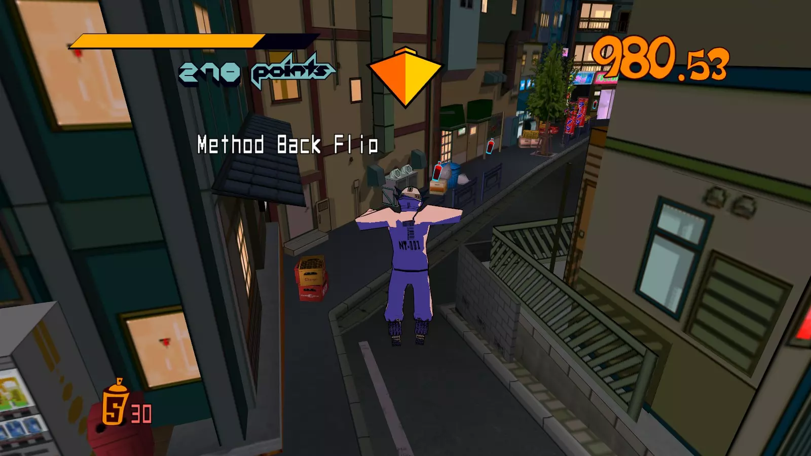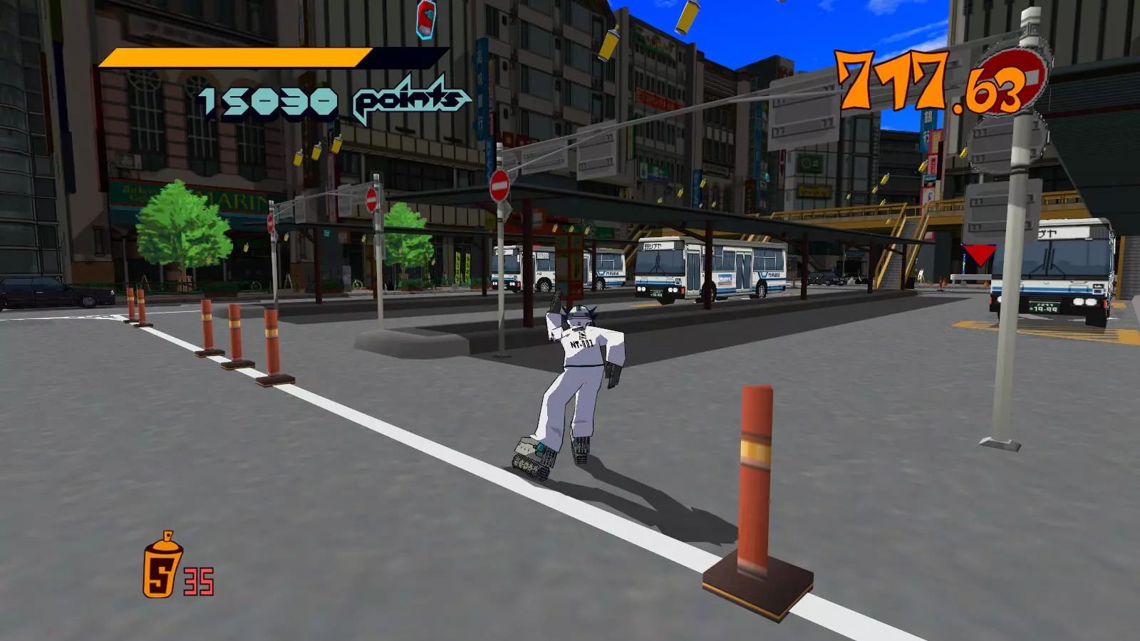 先在你面前的空调通风口处滑行来收集喷漆罐。继续滑行,跳过去攻击那个位于超大涂鸦处的噪音坦克,获取10个喷漆罐。不要喷涂那个超大涂鸦。